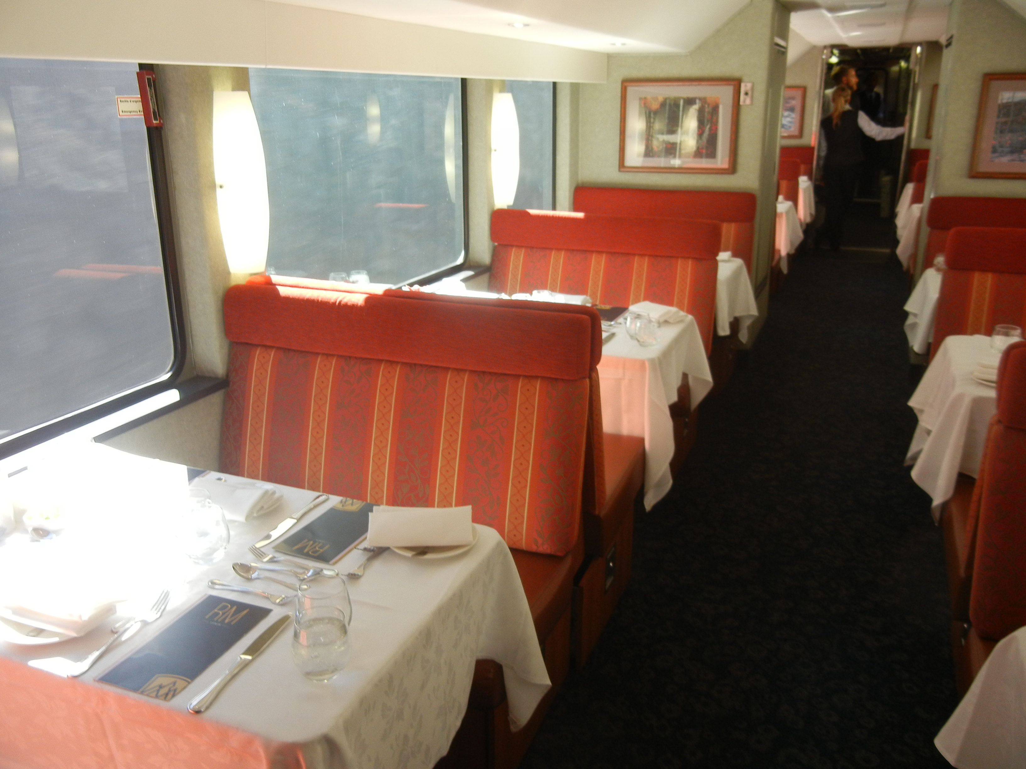 The dome car was above a cheerful and comfortable dining room which we shared in two sittings. Lesser classes of service dine at their seats like on an airplane. The food was superb with generous portions and wine or cocktails included.