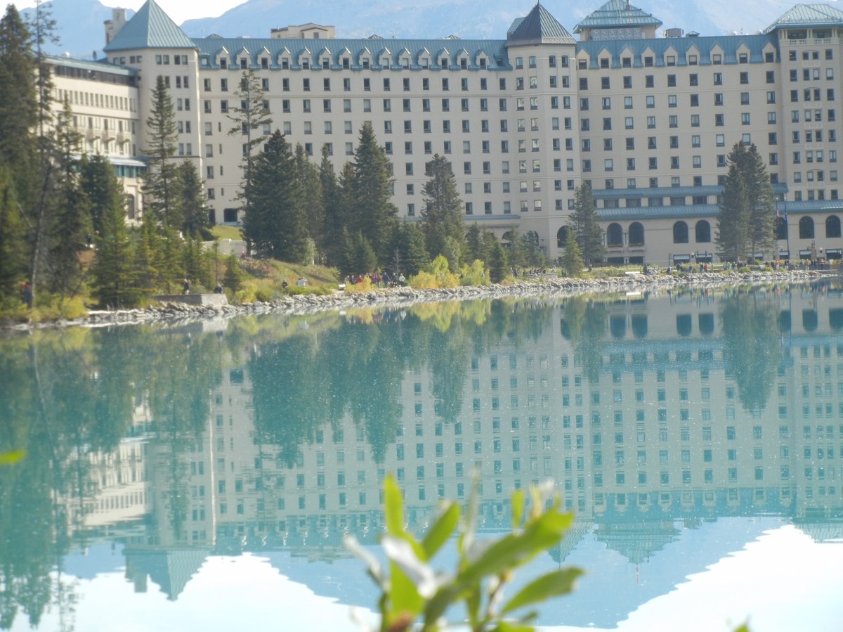 058 Published 05/10/2014 at 3264 × 2448 in THE CANADIAN ROCKIES BY TRAIN & BUS ← Previous Next → The iconic Fairmont Chateau Lake Louise reflected in the pristine water of the lake.