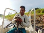Young children love to have visitors, and we were greeted with huge smiles as we walked up the muddy stairs from the river into the village. During the rainy season the water is so high the skiffs can land right up in the village. The homes here looked more sturdy with more wood than thatch compared to San Francisco village. We saw how they prepared their fruits and were offered samples including a delicious pineapple. They make a kind of tamale using a yucca flour made into a paste with meat or fish inside, wrapped in a large leaf, and boiled for an hour. Watching a woman chew on some paste and spit it into the mixture disabused me of any interest in tasting it.