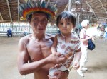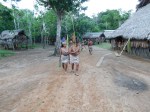 The village’s thatched homes seemed to be teeming with small children, with chickens and ducks as well as pet monkeys and even a pet sloth on the porches. Our guides showed us the trees and bushes that are used for cooking and medicinal purposes. After a stroll we all gathered in a large hall where two drummers and a flute player accompanied attractive young women dancers. At least twenty youngsters from toddlers to pre-adolescents marvelled at the elderly tourists dancing with their villagers. The teen men were evidently working or fishing. Before reboarding the skiffs, the local artisans presented their wares, a colorful assortment of woven baskets, wood carvings, and native jewelry at prices so reasonable trying to bargain would be sinful.