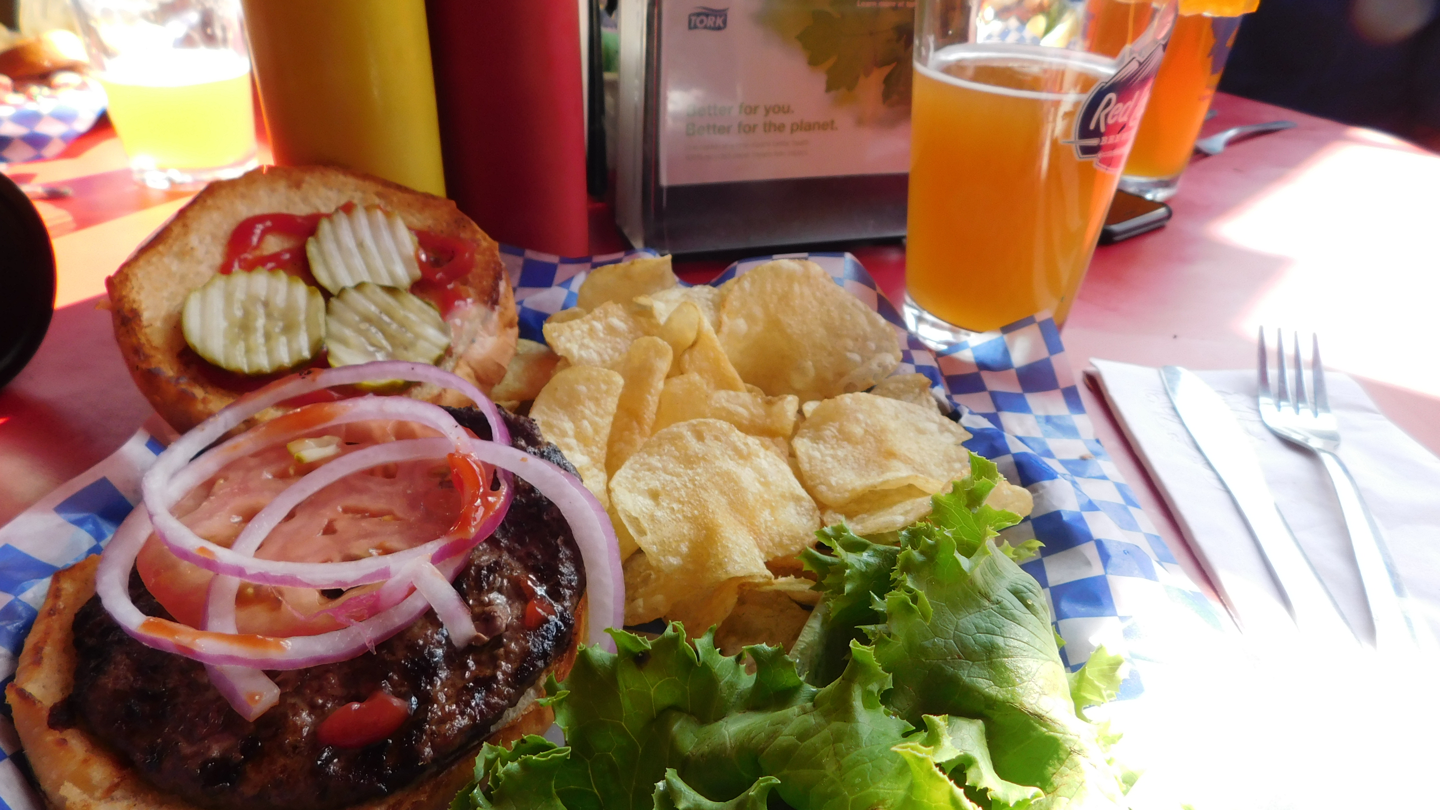 DSCN0731 Published 06/09/2017 at 4608 × 2592 in A TAUCK TOUR OF YELLOWSTONE & THE GRAND TETONS, August 22-30, 2017 ← Previous Next → A bisonburger and a Miner’s Gold beer.