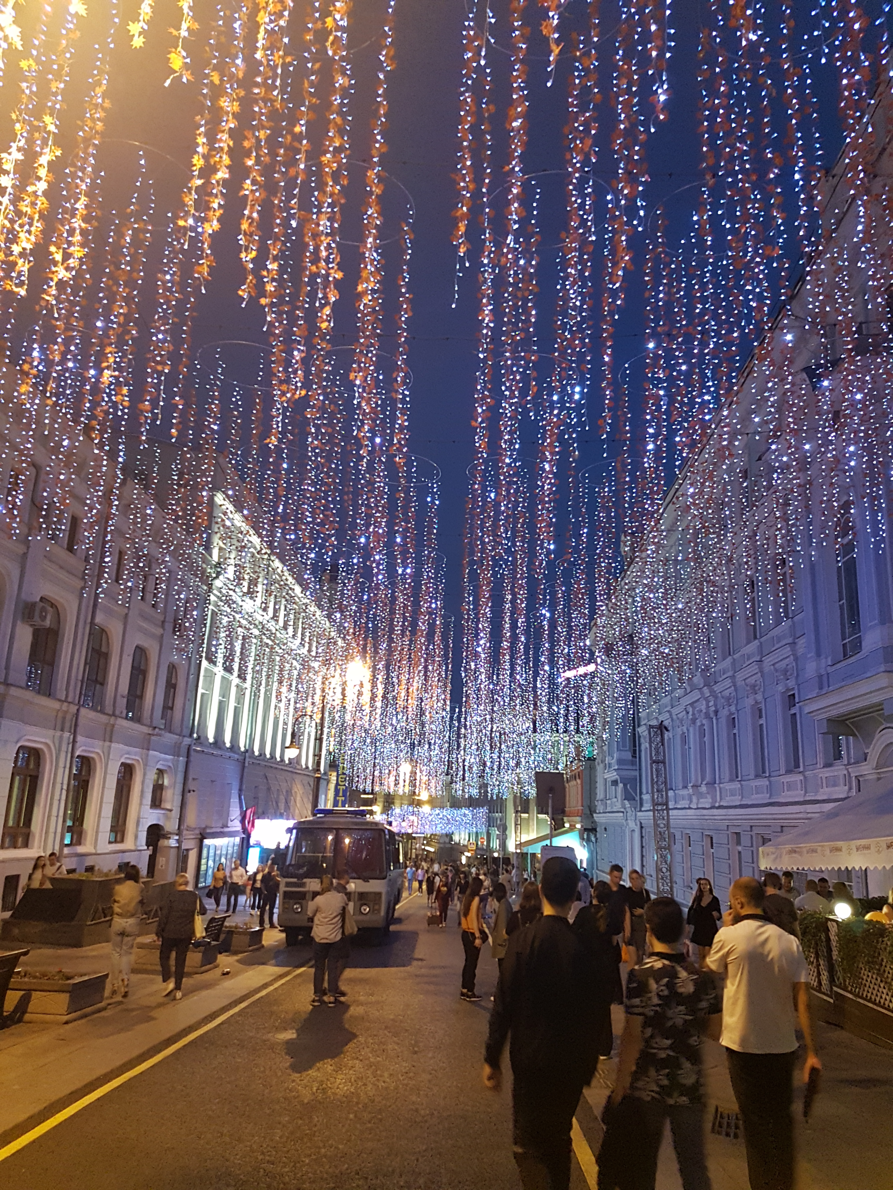 20180909_113935 Published 29/09/2018 at 3024 × 4032 in RUSSIA BY LAND, NOT BY SEA. Seven Days in Moscow & Saint Petersburg, Sept. 7-14, 2018 ← Previous Next → Hanging LED lights made the pedestrian street very festive.