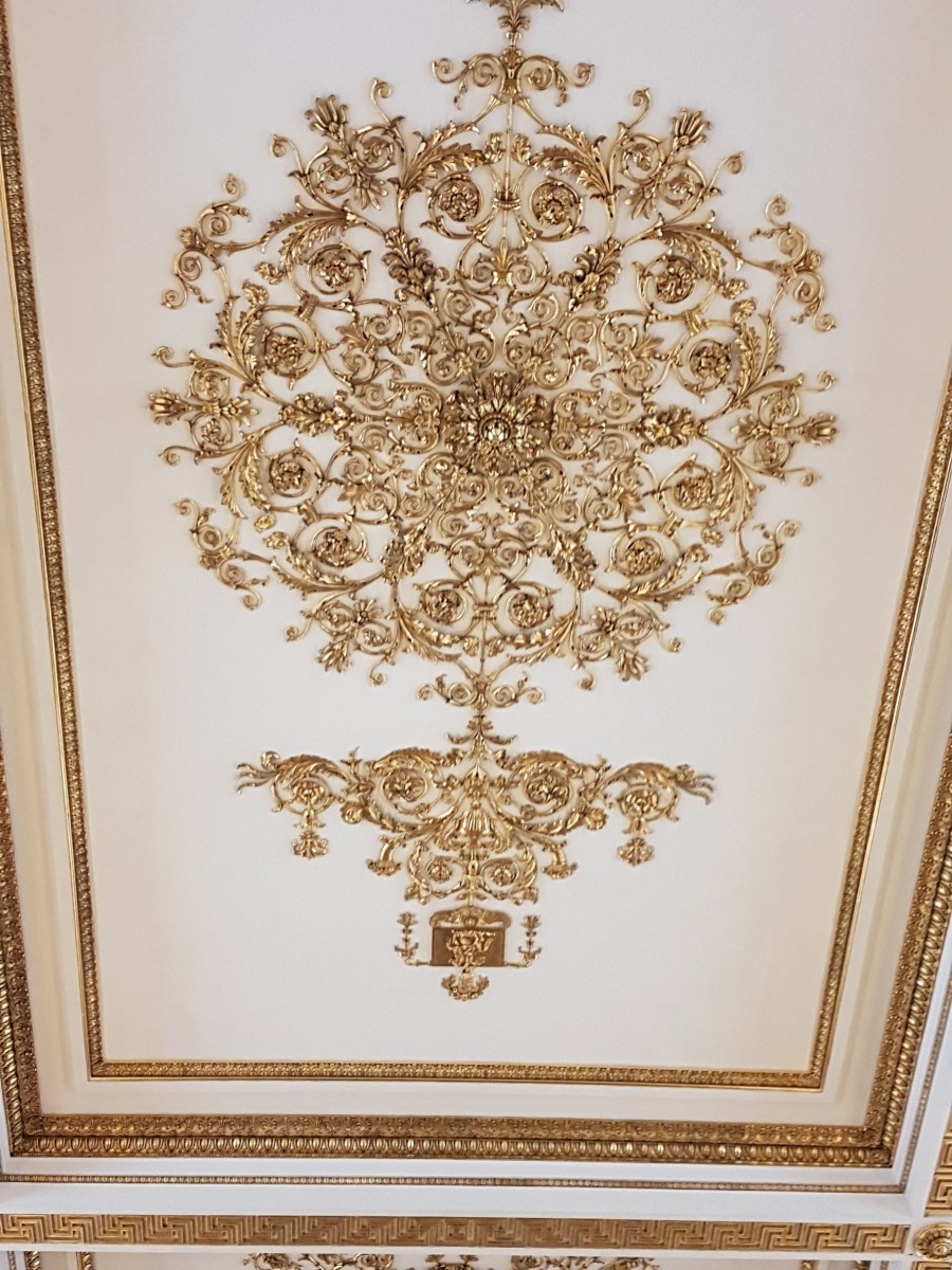 20180911_023931 Published 29/09/2018 at 3024 × 4032 in RUSSIA BY LAND, NOT BY SEA. Seven Days in Moscow & Saint Petersburg, Sept. 7-14, 2018 ← Previous Next → I have never before seen ceiling mouldings copied in the parquet floors of the palace.