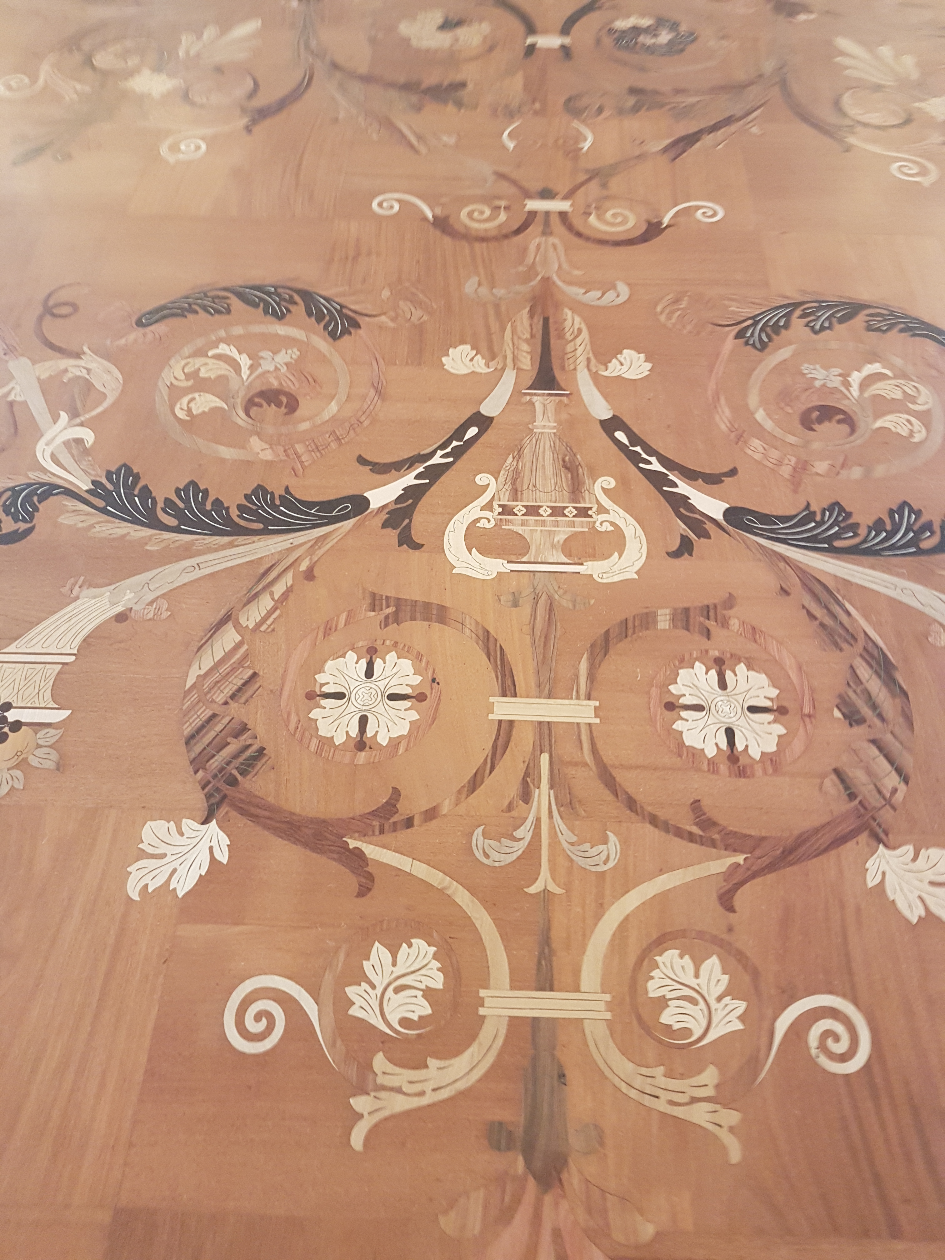 20180911_023941 Published 29/09/2018 at 3024 × 4032 in RUSSIA BY LAND, NOT BY SEA. Seven Days in Moscow & Saint Petersburg, Sept. 7-14, 2018 ← Previous Next → The parquet floors of multiple woods are patterened on the ceiling.