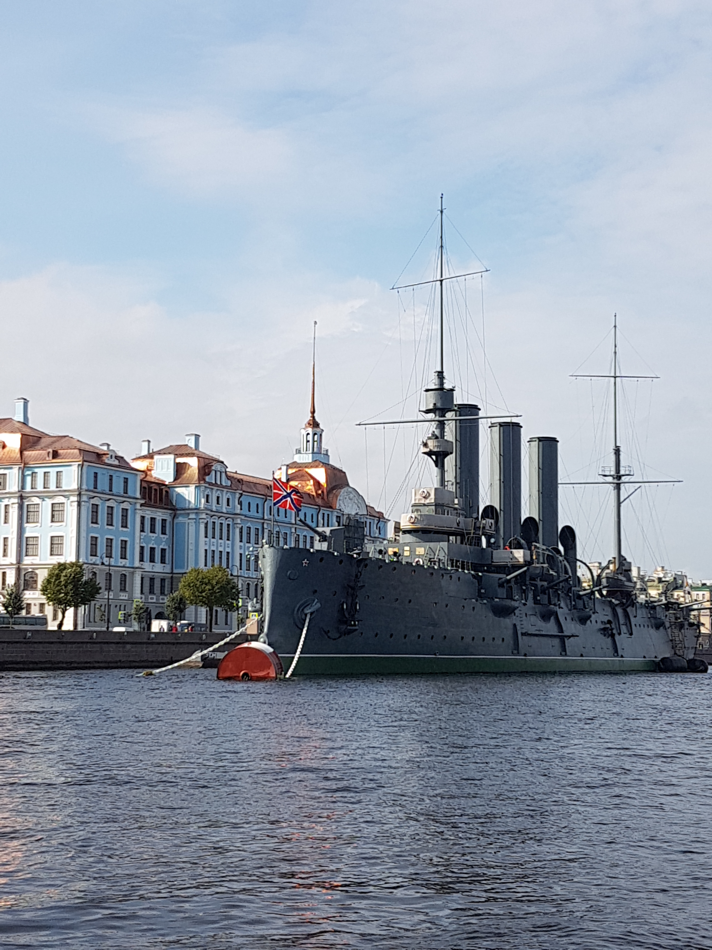 20180911_064441 Published 29/09/2018 at 3024 × 4032 in RUSSIA BY LAND, NOT BY SEA. Seven Days in Moscow & Saint Petersburg, Sept. 7-14, 2018 ← Previous Next → The Cruiser Aurora (1900), now a museum ship docked on the River Neva. A blank shot from its bow supposedly signaled the start of the October 1917 Revolution.