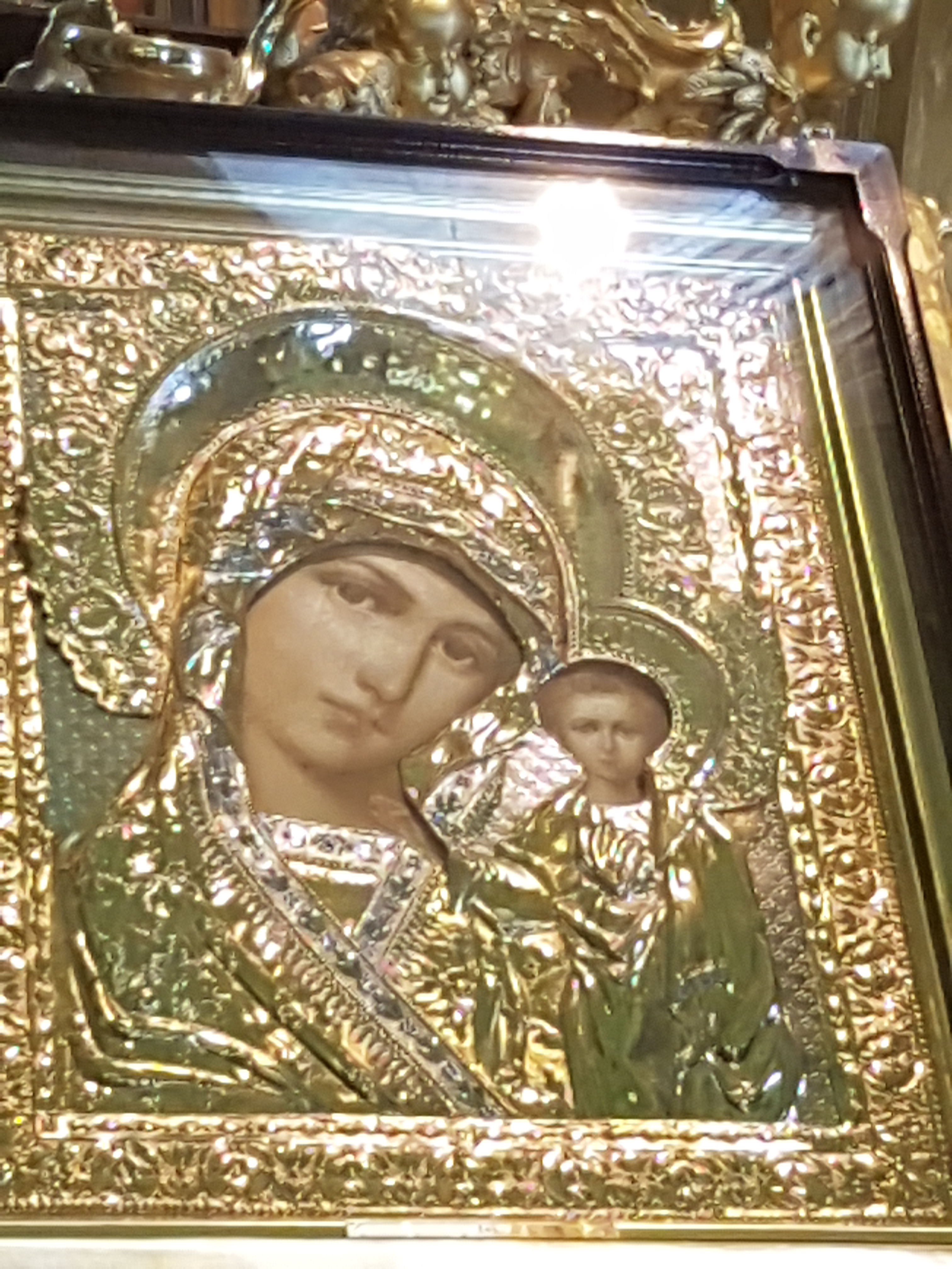 20180912_021755 Published 29/09/2018 at 3024 × 4032 in RUSSIA BY LAND, NOT BY SEA. Seven Days in Moscow & Saint Petersburg, Sept. 7-14, 2018 ← Previous Next → This icon of the Madonna is decorated with gold-leaf clothing.