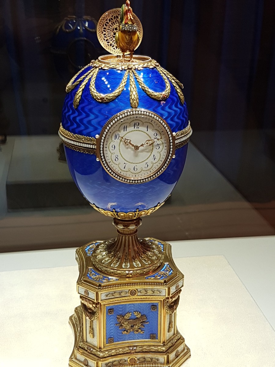20180913_074914 Published 30/09/2018 at 3024 × 4032 in RUSSIA BY LAND, NOT BY SEA. Seven Days in Moscow & Saint Petersburg, Sept. 7-14, 2018 ← Previous Next → My favorite egg, a clock made for a woman who owned gold mines whose minerals helped shape the eggs.