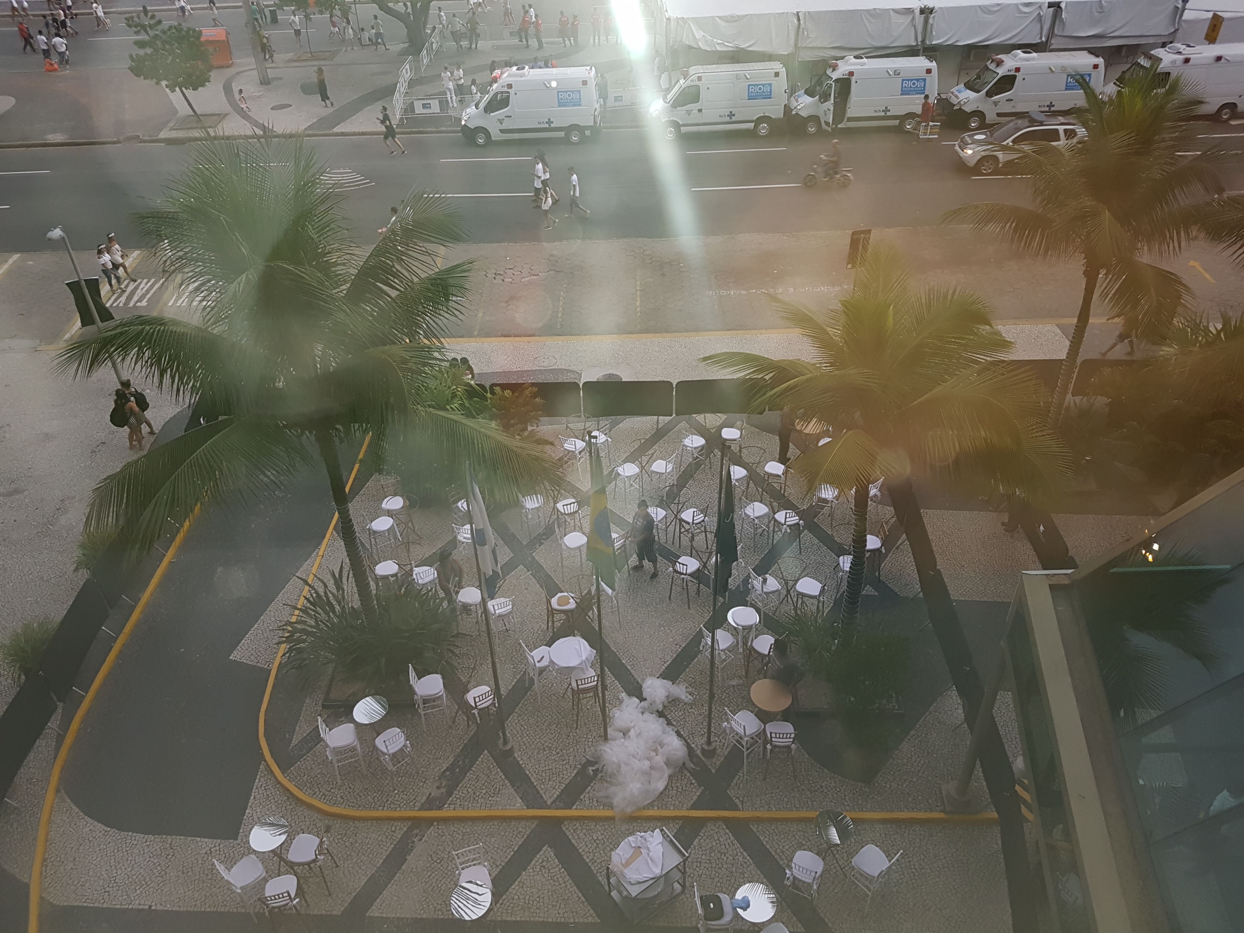 20181231_152532 Published 09/01/2019 at 4032 × 3024 in RINGING IN THE NEW YEAR AT THE LARGEST FIESTA IN THE WORLD: RIO DE JANEIRO & PARATY, BRAZIL ← Previous Next → From my hotel window I watched the staff set up tables and put up a barricade so guests would have an exclusive view of the show, champagne included.