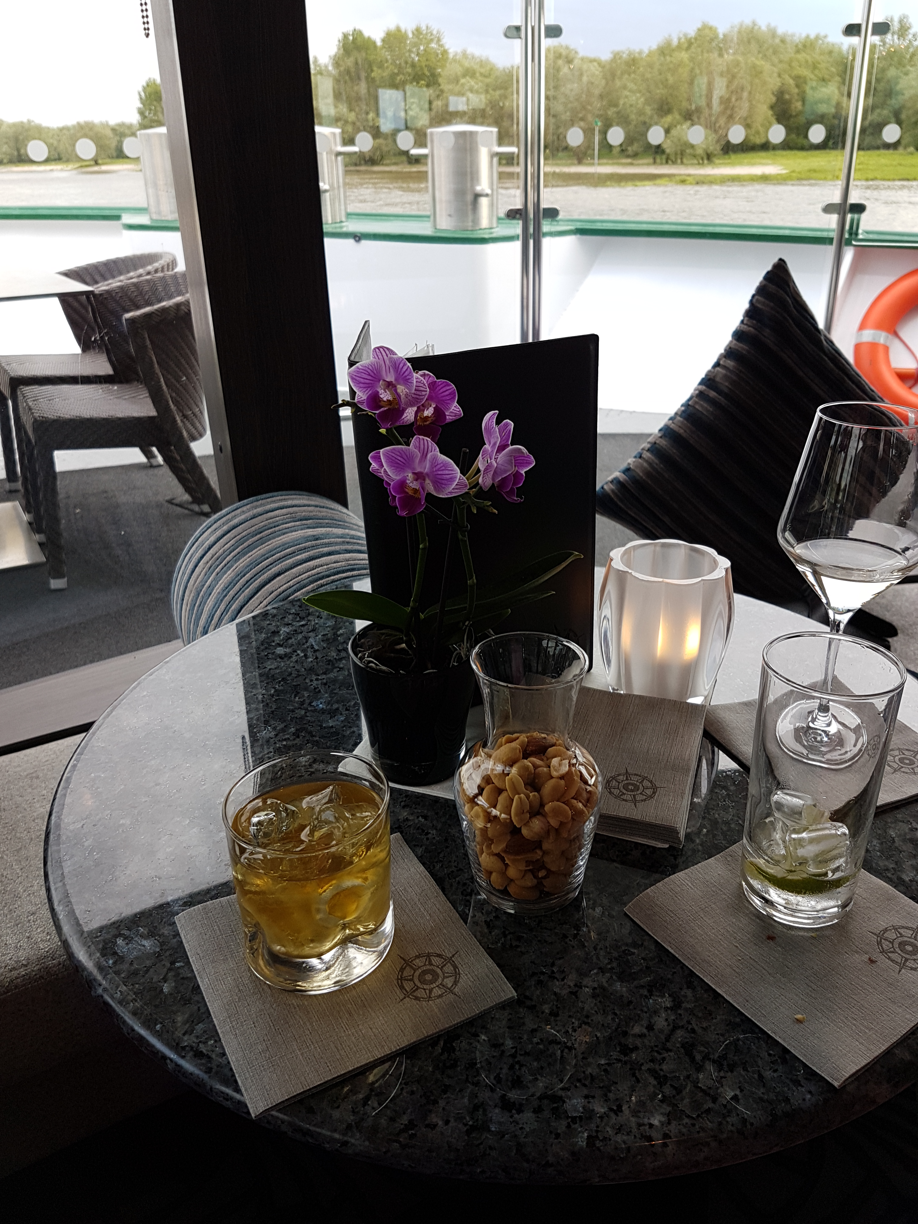 20190525_111747 Published 12/06/2019 at 3024 × 4032 in THE ROMANTIC RHINE, A CRUISE WITH TAUCK TOURS May 24-31, 2019 ← Previous Next → My Glenfiddich looks toward the bow in the lounge.