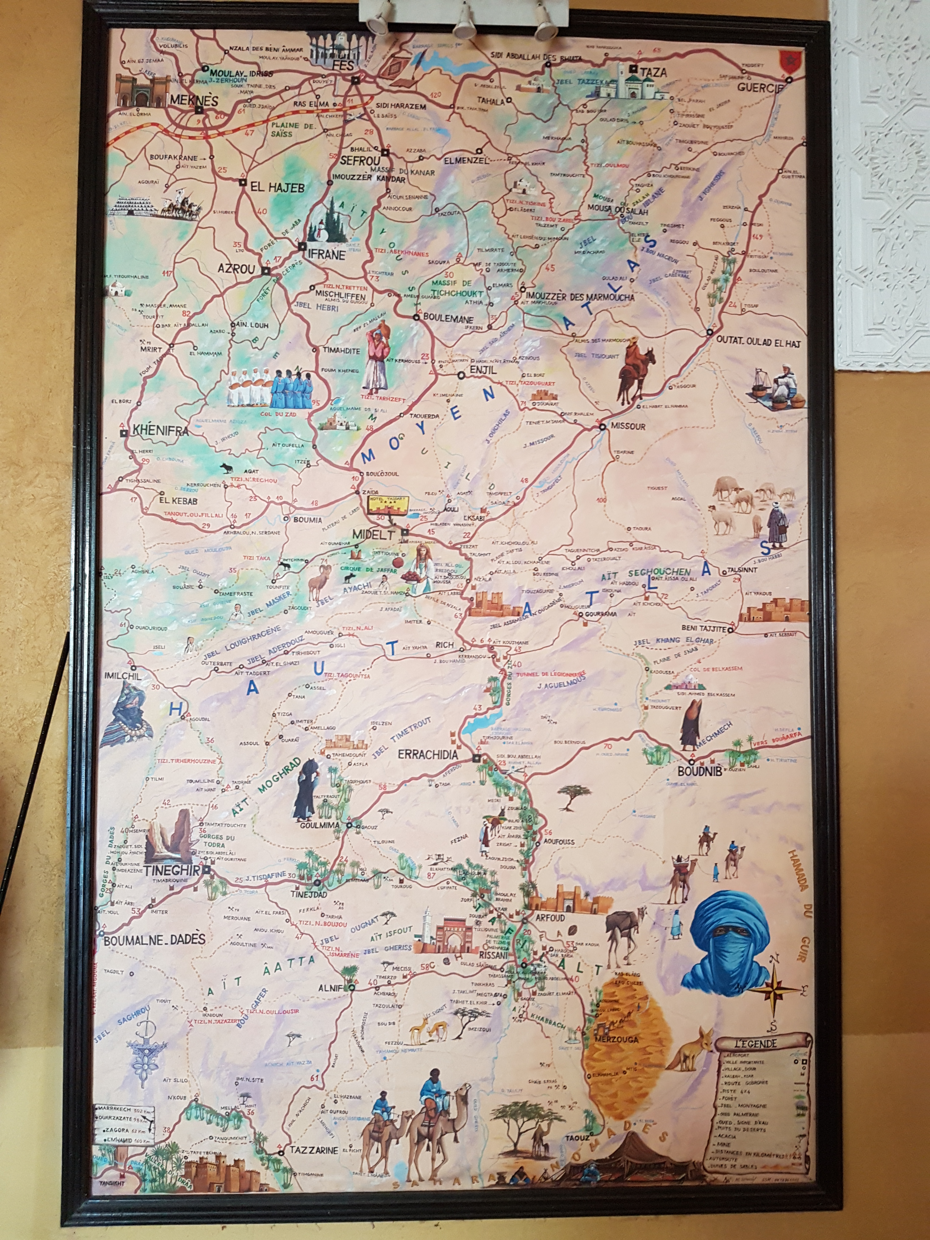 20190918_072008 Published 09/10/2019 at 3024 × 4032 in MOROCCO: FROM SEA TO SAHARA: A Tour with Alexander+Roberts September 15-27, 2019 ← Previous Next → A huge map in the lobby of the Hotel Taddart illustrated the Moroccan tour sites.