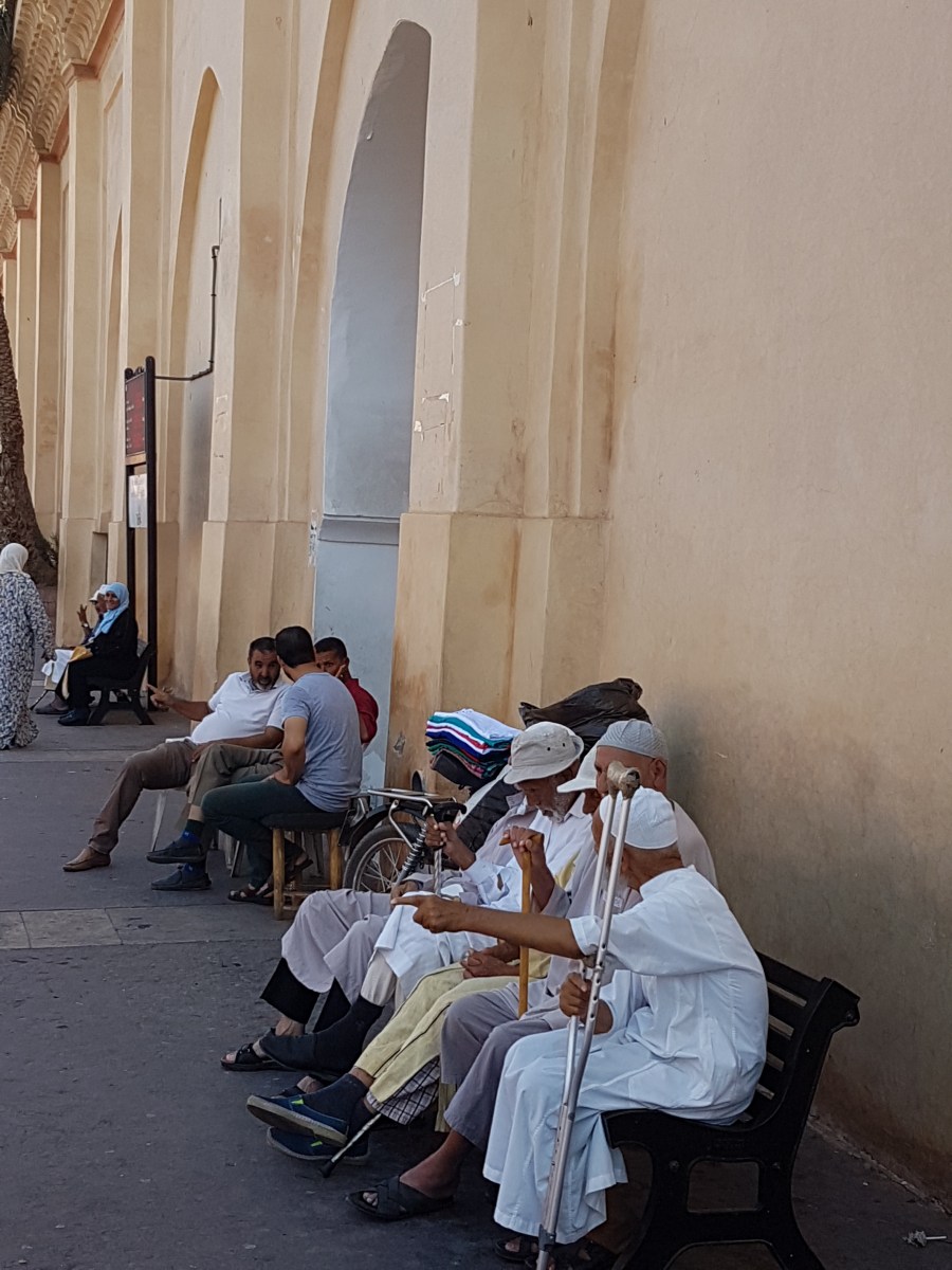 20190921_051956 Published 10/10/2019 at 3024 × 4032 in MOROCCO: FROM SEA TO SAHARA: A Tour with Alexander+Roberts September 15-27, 2019 ← Previous Next → Elderly men sit idly along the streets.