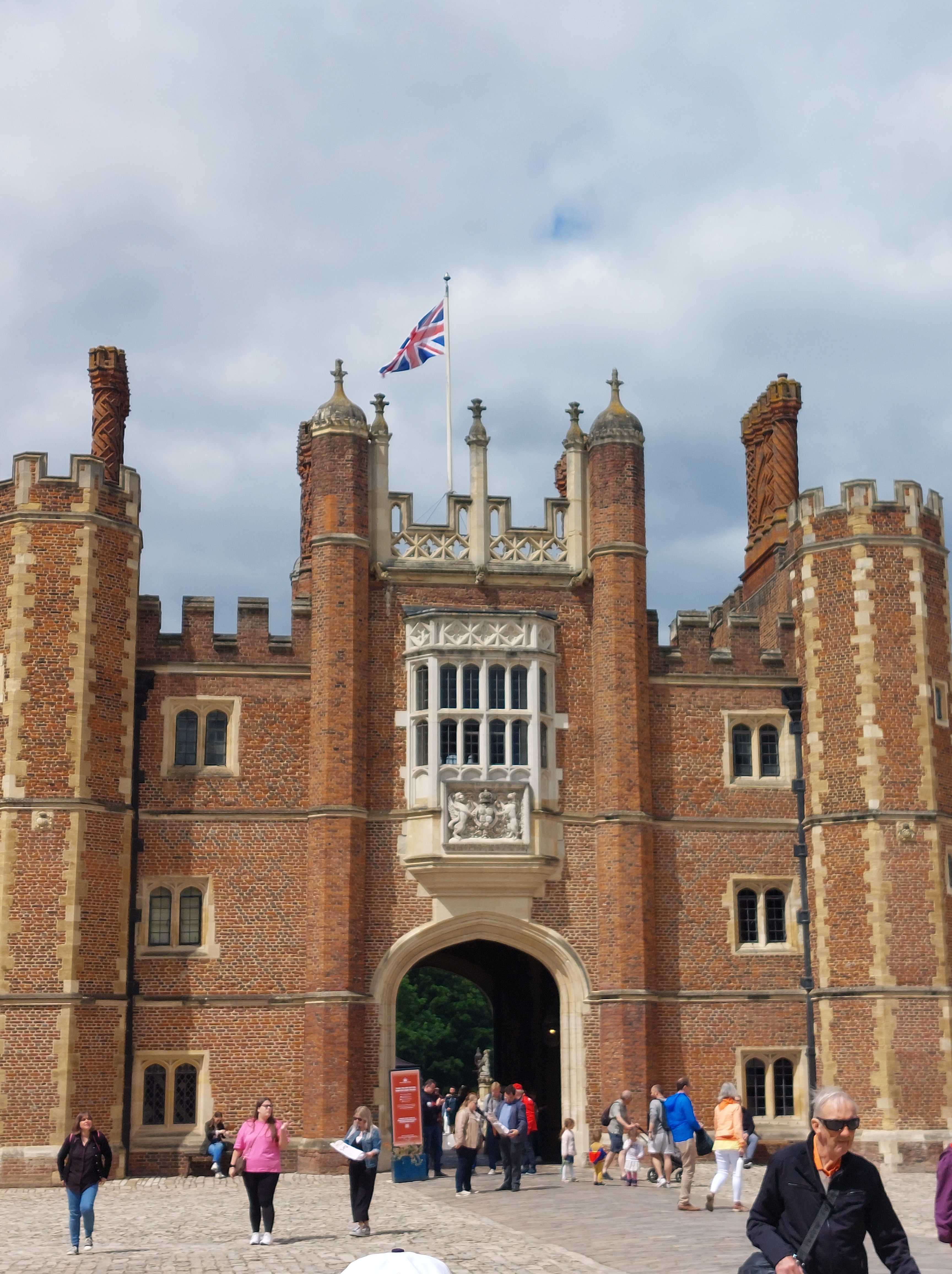 In less than an hour, one could spot Hamtpon Court on the shore. Lord Chancellor, later Cardinal Thomas Wolsey resided in the medieval manor here for 15 years until he fell into disfavor with King Henry VIII who forced Wolsey to give it up. Both Wolsey and Henry enlarged and embellished it into a Tudor palace. All six wives of Henry VIII eventually lived (or died) here. In grade school I had learned the rhyme: ” Henry the Eighth to six wives he was wedded; one died, one survived, two divorced, two beheaded.” No time for the gory details here. It was a residence for royals plus 30 suites for the most prestigious guests, until Queen Victoria opened it to the public in 1838. The great hall still exhibits some of the hundreds of Belgian tapestries Henry collected. The ancient kitchen and kitchen garden are open to the public.