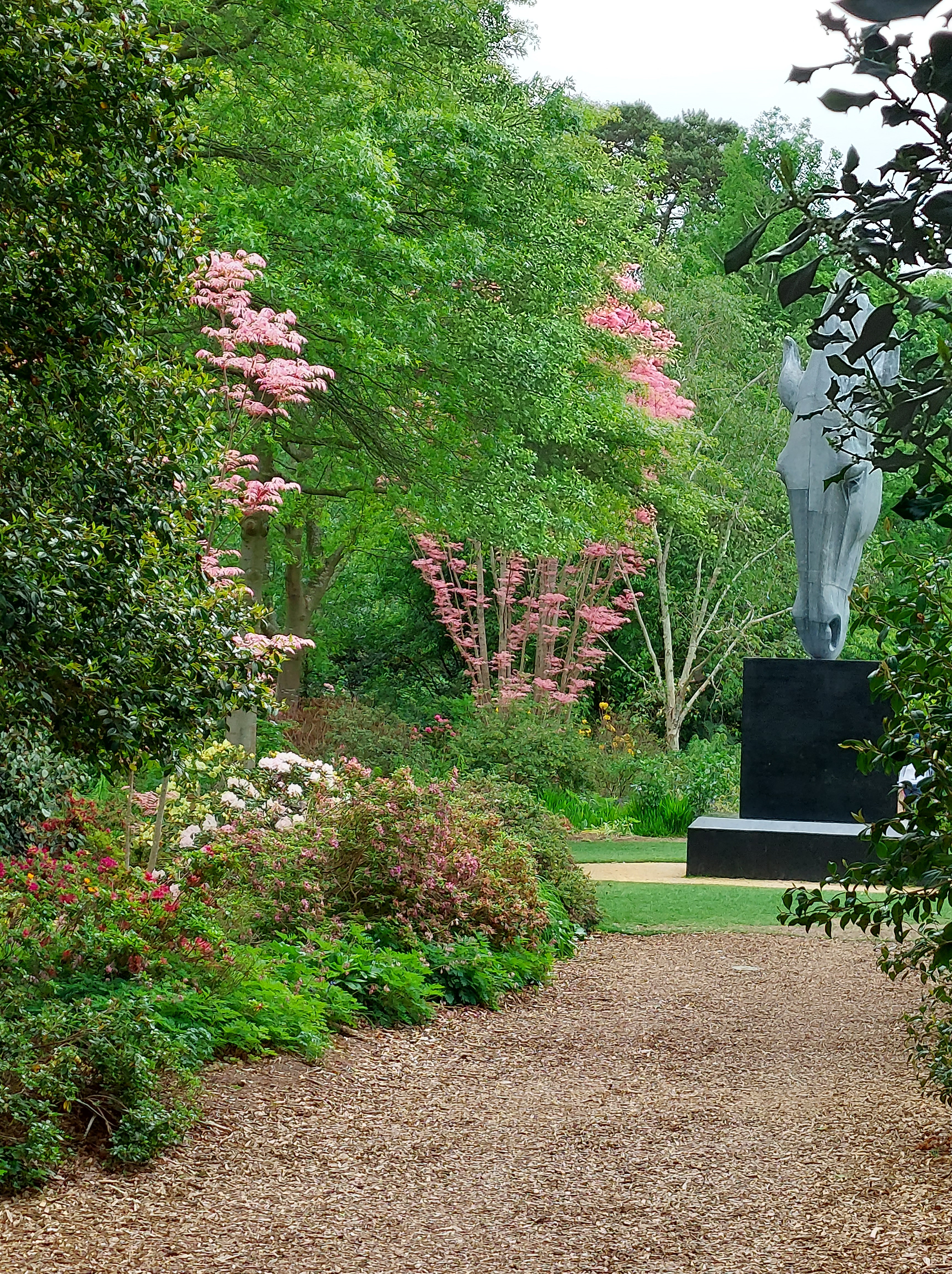 After lunch on our own at Leeds Castle, we moved on to Pashley Manor in the East Sussex countryside. It began as a hunting lodge in the 1400s, later owned by the Lord Mayor of London in 1457. A later owner built a “new” Tudor residence nearby in 1550, which still stands today. A “modern” terrace was added to the back in 1720, its striking feature the enormous wisteria that covers the facade. Its eleven acres include artistically placed sculptures and several gardens devoted to particular species. We missed the 48 thousand tulips in April, and we were too early for the more than 100 varieties of roses in June or the August dahlia fest. But we had the perfect date for wisteria and rhododendron.