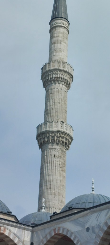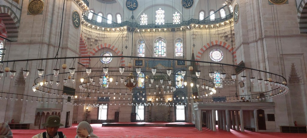 On the third day with guide Tarik, we set off at 10 am for the largest mosque in the city, built upon a high hill with a sensational view of the city around the Golden Horn. It is regarded as the best work of the imperial architect Mimar Sinan, responsible for numerous mosques and palaces in the city. Most of the work was completed between 1550 and 1557 for Sultan Suleiman the Magnificent. It lacks the ornamentation of the Blue Mosque, perhaps because the sultan was more inclined to the Koran’s admonition of simplicity and humility. The Sultan planned to be buried here along with his wife, so there are two enormous mausoleums adjacent to the mosque, the Sultan’s being the largest in the country. It is adjoined by the tomb of his wife Roxelana who played a prominent part in the events of the regime and took up many pages of the history I read before arrival. Behind the mausoleums is a cemetery for the soldiers and grand viziers of the regime, with some tombstones adorned with turbans recognizing their importance.
