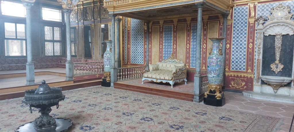 Arguably the most famous buildings in Istanbul are the Hagia Sophia and the Blue Mosque, both UNESCO World Heritage Sites. Entering the landscaped floral grounds of the Blue Mosque from the square, one is awed immediately by the dazzling colossal dome and six minarets. Constructed between 1609 and 1617, the mosque walls are adorned with thousands of decorative tiles, many in blue. It is still a functioning religious center, one of over 1700 mosques in the city, so tourism is detained during the five prayer times.Tarik knew the times when best to visit each venue, and the next one he steered me to was the Topkapi Palace.