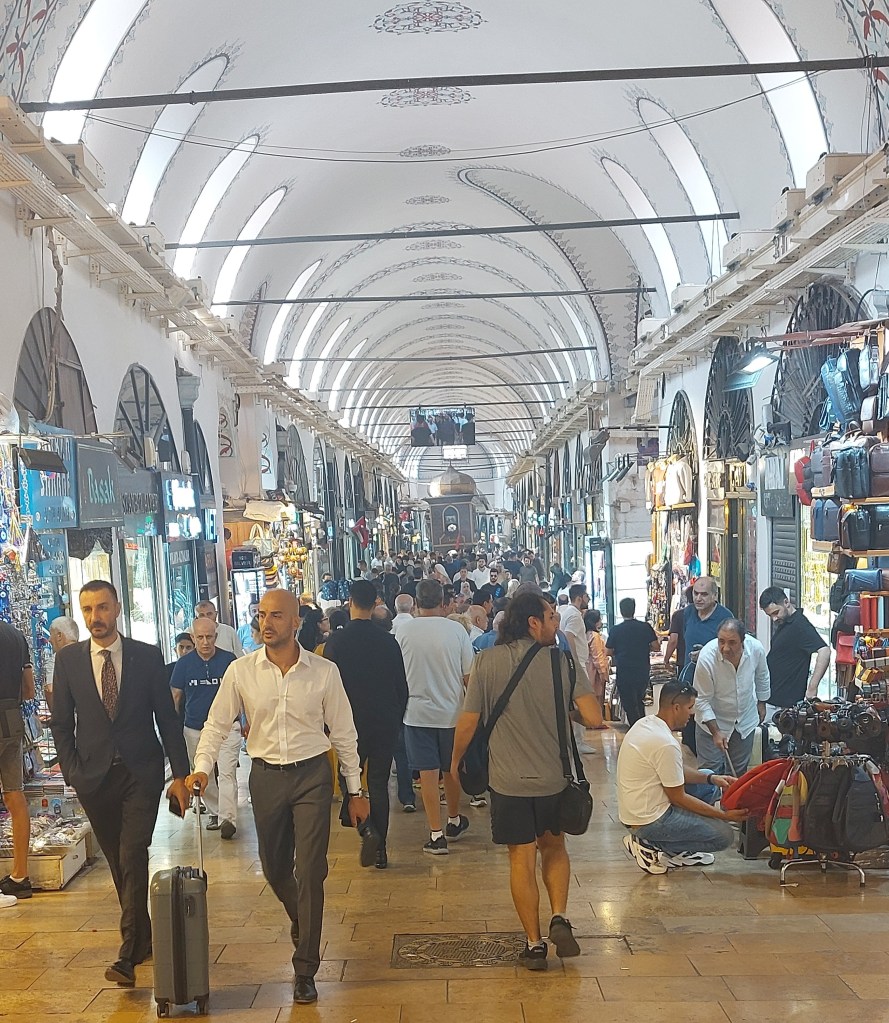 After touring the Hagia Sophia, Tarik walked me through a maze of streets to the Grand Bazaar, the oldest and largest covered market in the world, built upon 61 streets with 22 gates and 4000 shops. The oldest date painted over a shop is 1461, although the market did not reach its current size until the beginning of the 17th century. As many as 400 thousand traders and shoppers visited it daily at its peak. Ottoman control of an enormous region covering parts of Europe and Asia made it a center for trade caravans and control of Mediterranean commerce. Some of my friends who have visited rave about it and lingered there. I am not a shopper and, having already walked for miles, I asked Tarik to move on after half an hour.