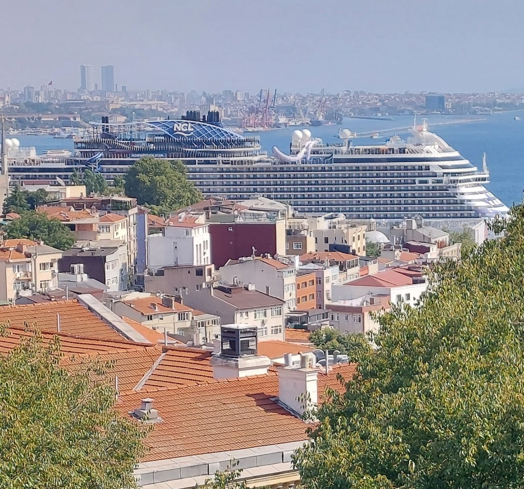 For some time, we stood in front of food stalls near the New Mosque for samples of olives and other small dishes. Finally, we walked to a sit-down restaurant for a breakfast I would never make part of my morning routine. At least there was a somewhat adequate bathroom. I won’t describe all of the little dishes we tried throughout the tour. We were near the Spice Market and spent a half hour there, another repeat I could have foregone. Then we were very close to the commuter ferry to Kadikoy, and we repeated the trip I had made with my guide the day before. We stopped in front of several food stalls, one offering all the cold mussels we could eat standing up. Another standup spot offered a gooey chocolate pastry I declined. We did have three more sit-down occasions. The first lunch was a kabob wrap and a pizza-like pastry. Next, we had second lunch dining on Doner, tender and delicious plates of meat sliced from a spit. Finally, we sat down in a pastry shop for baklava with goat-milk ice cream and coffee or tea. Most of us were more than satiated, and several people complained about all the walking and standing that I had become accustomed to.We didn’t finished noshing about 3:30 on the advertised half-day tour. By the time we got back to the ferry and reached the European shore, heavy traffic made it difficult to find a taxi. Finally, I found a driver but he refused to use the meter and demanded about double what I expected to pay. (News articles I had seen noted a huge shortage of taxis in the city and numerous tourist complaints about overcharging). I was grateful to get back to the hotel by 4:30. I had not expected the “half-day tour” to consume the entire day. I was appalled to learn that two of the couples had chosen this ship excursion as their only activity in the city, missing out on everything else I’ve described above.