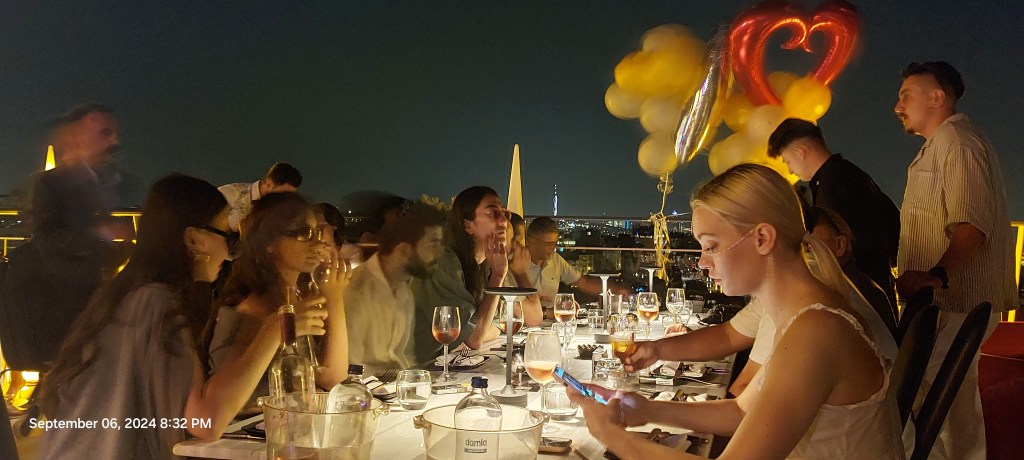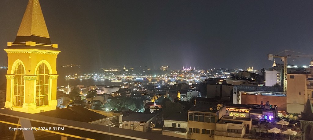 Few taxis passed on the boulevard outside and a staff member rescued me from the sun, giving me a seat while he phoned for a cab. I was glad toback at the hotel earlier than usual but sad that it was overcast and windy, making the pool uninviting. I wasn’t hungry in the evening, but I knew I wanted to try one rooftop restaurant as part of my visit. A friend had raved about Nostra Casa, but it’s located in the Blue Mosque area and, at dinner time, the traffic would mean as much as 45 minutes each way. I showed the concierge a list of restaurants I had found online and he told me I could walk to Restaurant 360 in twenty minutes. He kindly phoned in a reservation for me. It took ten minutes just to walk to the end of Taksim Square where so many streets intersected I had to ask which one was Istiklal Avenue. Caddesi 163 was a long way down the avenue so it took me more like 35 minutes to arrive. The rooftop restaurant on the eighth floor of an apartment building (the elevator only goes to the sixth floor) is not very elegant but the terrace view of the city at night more than compensates. I knew to expect high prices and was willing to splurge. The gin tonic cost the equivalent of 15 dollars for the gin and three dollars for the tonic water. I had no room for an appetizer and chose just an entrée, slow roasted cherry duck, which appeared to have been roasted two or three times it was so dry and chewy. Adjacent to my table was a party of about a dozen diners, everyone but one smoking heavily. The women were dressed elegantly, the men slovenly casual as if they were Americans. My American Express bill shows the lire converted to 74 dollars, not really value for price. Before I departed, a female violinist made the rounds of tables, her repertoire not to my liking. At 9 pm, Istiklal Avenue was still wall-to-wall pedestrians. Tired after a long day, I spotted a taxi on a side street and was glad to pay an overcharge to return to the hotel. It was still early enough to post some photos and read the news headlines.