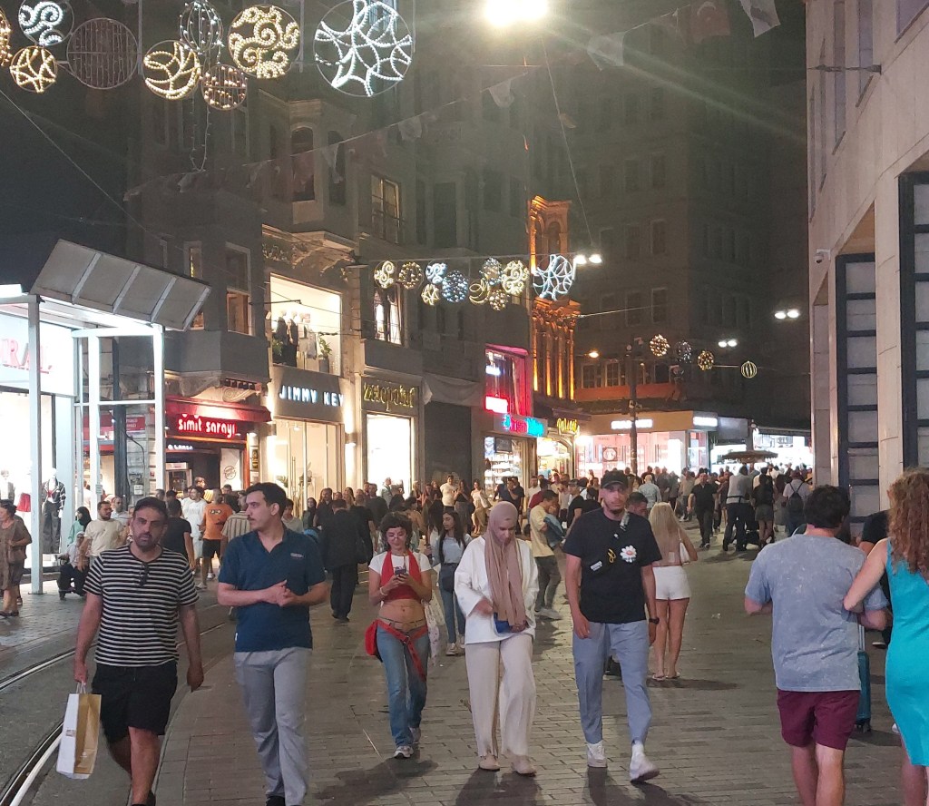 From the ferry dock, guide Tarik led me to a metro station and after just a few stops we reached Taksim Square, the city’s main transportation hub. The huge plaza, like Beijing’s Tiananmen Square or Mexico’s Zocaló, had been the scene of political demonstrations until they were outlawed by the authoritarian Erdogan regime. Not very photogenic, it is crowded with residents and tourists making their way to adjacent streets, particularly Istiklal Caddesi (the c in caddesi is pronounced as a j; addresses are often listed as Cad. and the number). Istiklal (Independence) Avenue is a pedestrian street, except for an ancient trolley that occasionally scrambles the crowds to the side. It makes Manhattan’s Times Square seem uncrowded by comparison. Just short of a mile long, with hundreds of stores and restaurants, it bustles with humanity day and night. Tarik led me to Midpoint, a restaurant at Cad.187, with a second-floor balcony view of the city and the Bosporus. I would have loved a beer with my Turkish lunch, but it would have knocked me out given fatigue and the heat of the day (about 85 F). It provided a restful space to relax and sip a lemonade. I was glad we lingered there for over an hour before Tarik pushed on to the Spice Market.