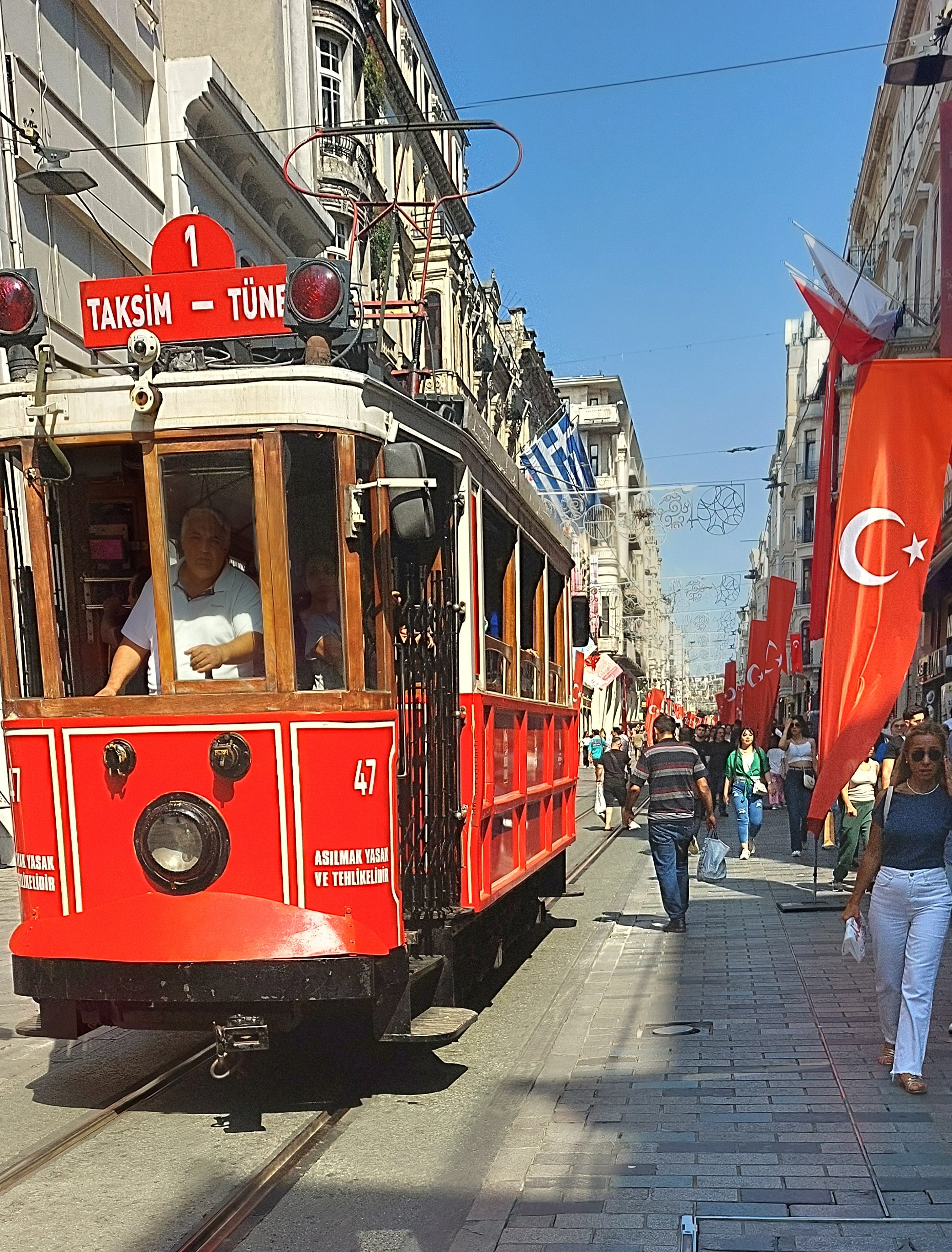 From the ferry dock, guide Tarik led me to a metro station and after just a few stops we reached Taksim Square, the city’s main transportation hub. The huge plaza, like Beijing’s Tiananmen Square or Mexico’s Zocaló, had been the scene of political demonstrations until they were outlawed by the authoritarian Erdogan regime. Not very photogenic, it is crowded with residents and tourists making their way to adjacent streets, particularly Istiklal Caddesi (the c in caddesi is pronounced as a j; addresses are often listed as Cad. and the number). Istiklal (Independence) Avenue is a pedestrian street, except for an ancient trolley that occasionally scrambles the crowds to the side. It makes Manhattan’s Times Square seem uncrowded by comparison. Just short of a mile long, with hundreds of stores and restaurants, it bustles with humanity day and night. Tarik led me to Midpoint, a restaurant at Cad.187, with a second-floor balcony view of the city and the Bosporus. I would have loved a beer with my Turkish lunch, but it would have knocked me out given fatigue and the heat of the day (about 85 F). It provided a restful space to relax and sip a lemonade. I was glad we lingered there for over an hour before Tarik pushed on to the Spice Market.