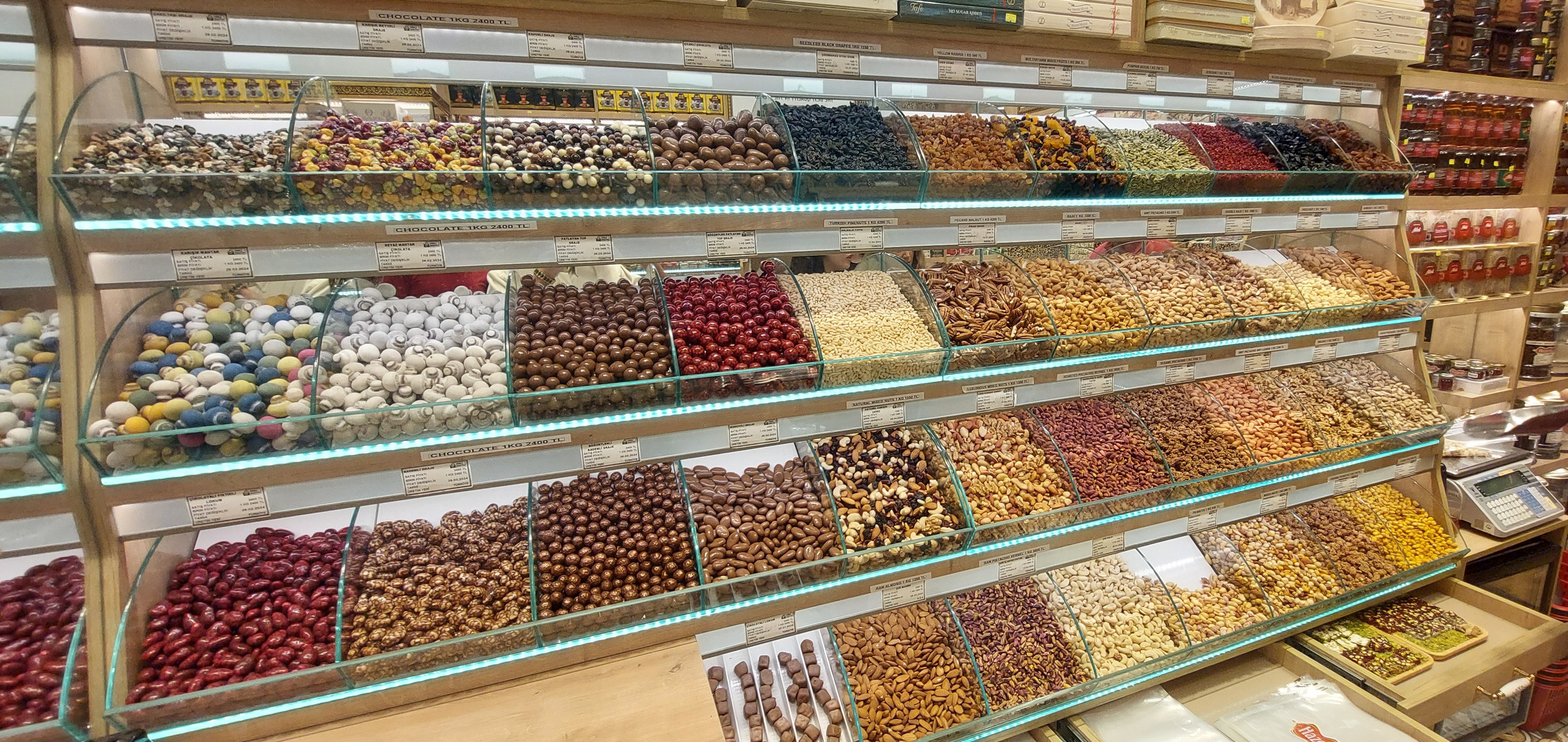 You may recall that Columbus hoped to find the spices Europe depended upon, scarce because commerce had been cut off by Ottoman control of the region. Ships from many nations brought their spices to a port where warehouses and commercial stalls sold them to merchants and the public. The demand for spices declined in modern times and more and more shops today feature Turkish Delight (a candy and nut confection), and many varieties of sweets, dried fruits, and nuts. The shop keepers are a bit aggressive in pushing visitors to sample their merchandise. After one shop keeper forced various samples on me, I succumbed to a “big” purchase of 200 grams of candy- coated peanuts. After seeing the Grand Bazaar, the Spice Market holds no magic and I entreated Tarik to cut the visit short.
