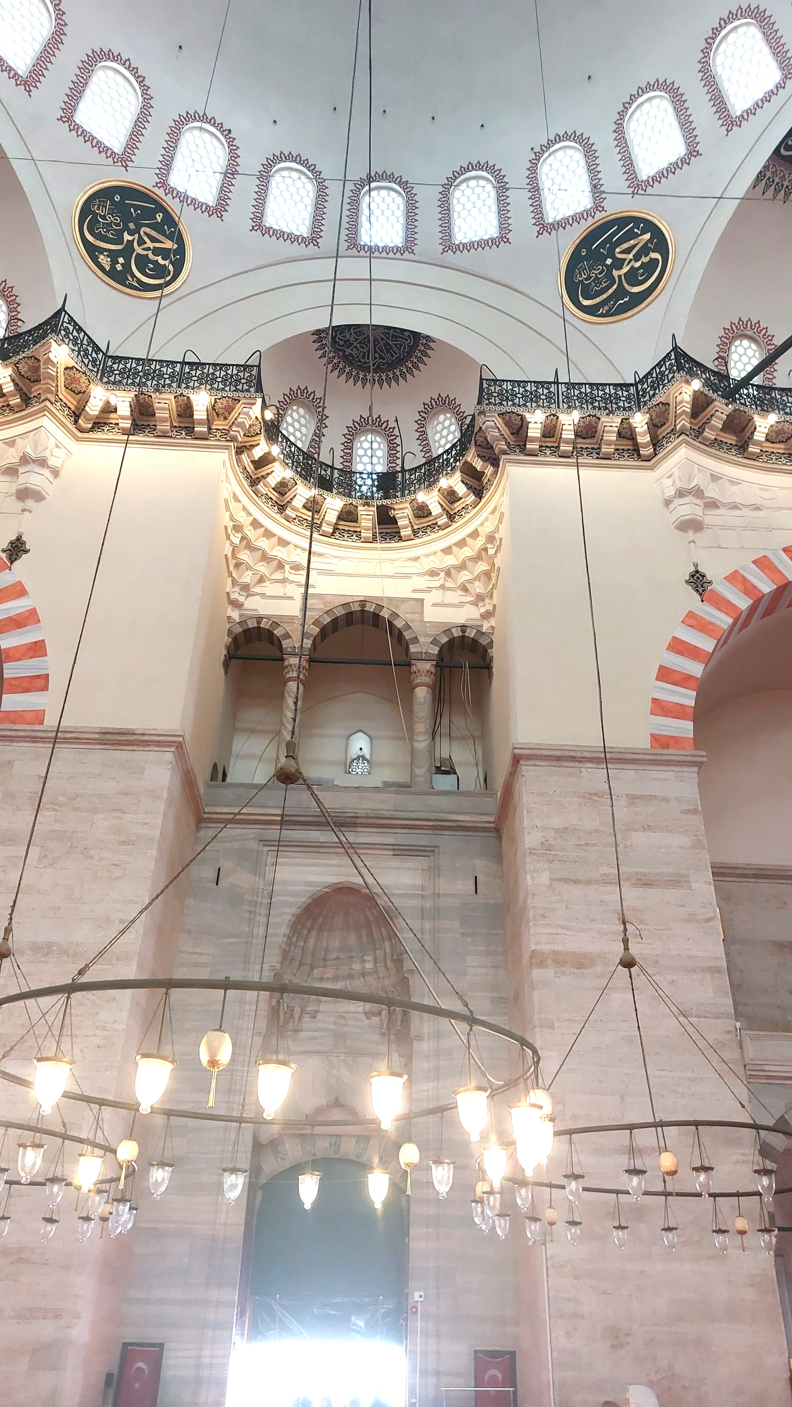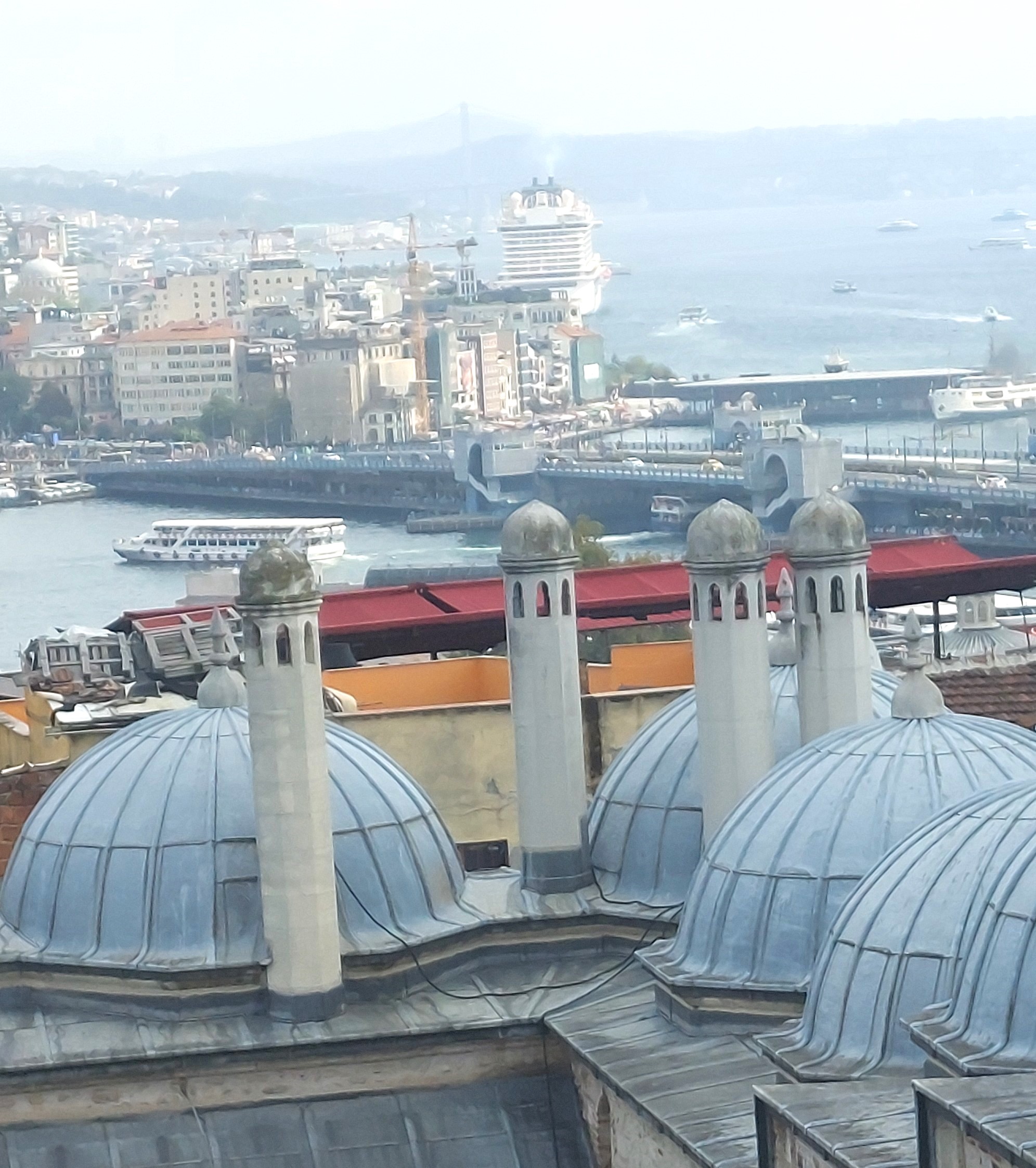 On the third day with guide Tarik, we set off at 10 am for the largest mosque in the city, built upon a high hill with a sensational view of the city around the Golden Horn. It is regarded as the best work of the imperial architect Mimar Sinan, responsible for numerous mosques and palaces in the city. Most of the work was completed between 1550 and 1557 for Sultan Suleiman the Magnificent. It lacks the ornamentation of the Blue Mosque, perhaps because the sultan was more inclined to the Koran’s admonition of simplicity and humility. The Sultan planned to be buried here along with his wife, so there are two enormous mausoleums adjacent to the mosque, the Sultan’s being the largest in the country. It is adjoined by the tomb of his wife Roxelana who played a prominent part in the events of the regime and took up many pages of the history I read before arrival. Behind the mausoleums is a cemetery for the soldiers and grand viziers of the regime, with some tombstones adorned with turbans recognizing their importance.