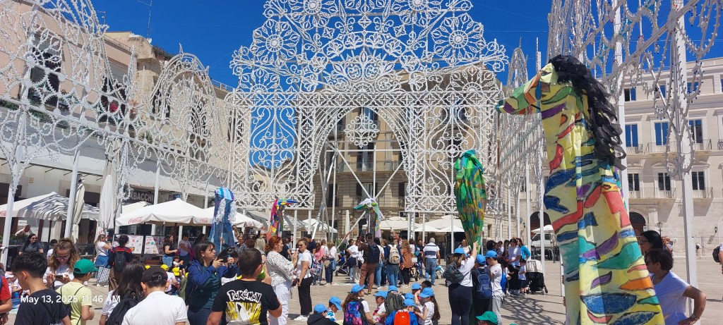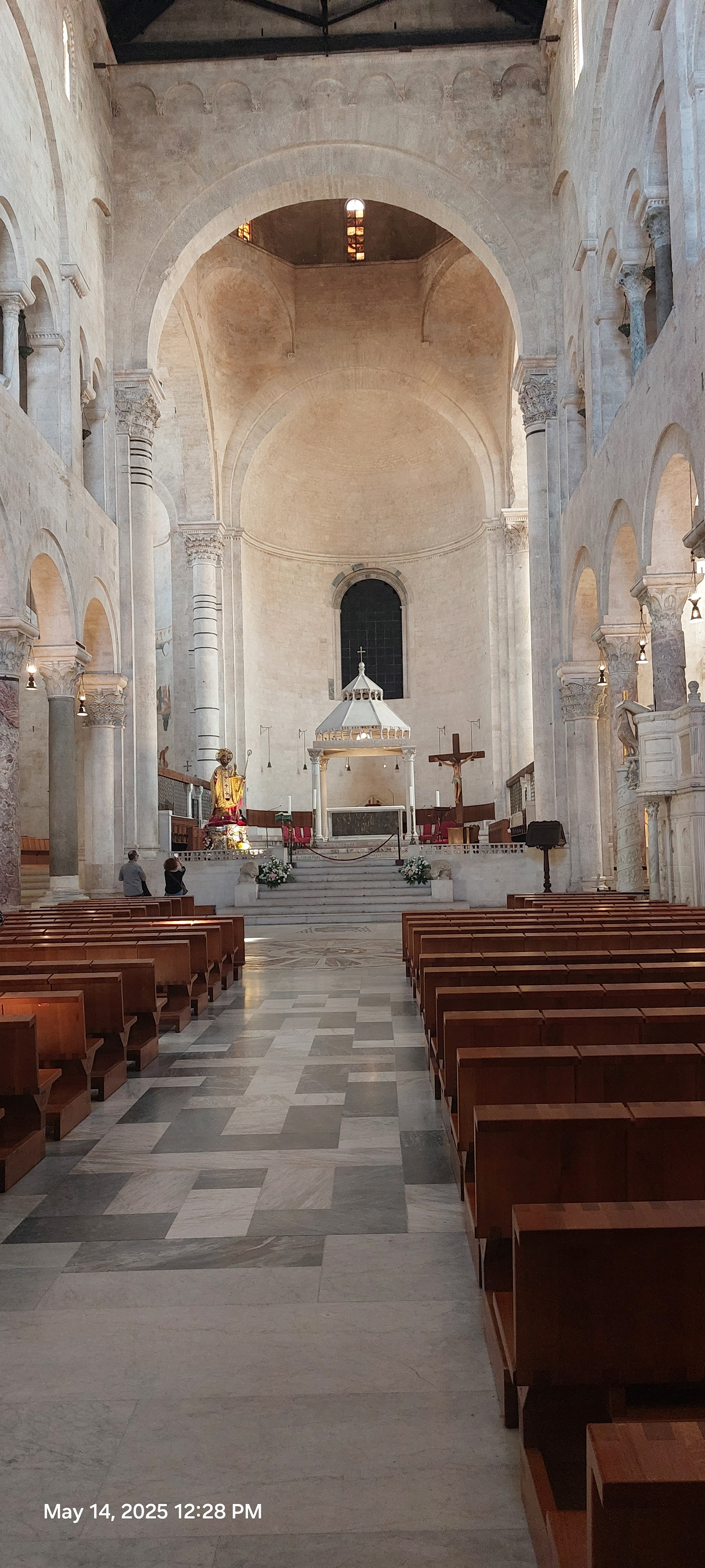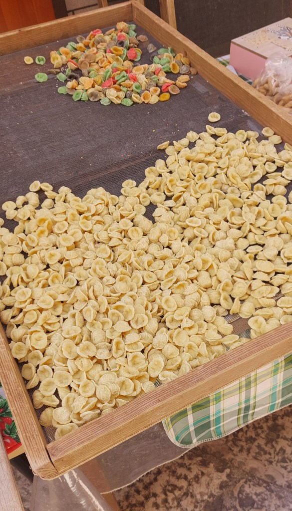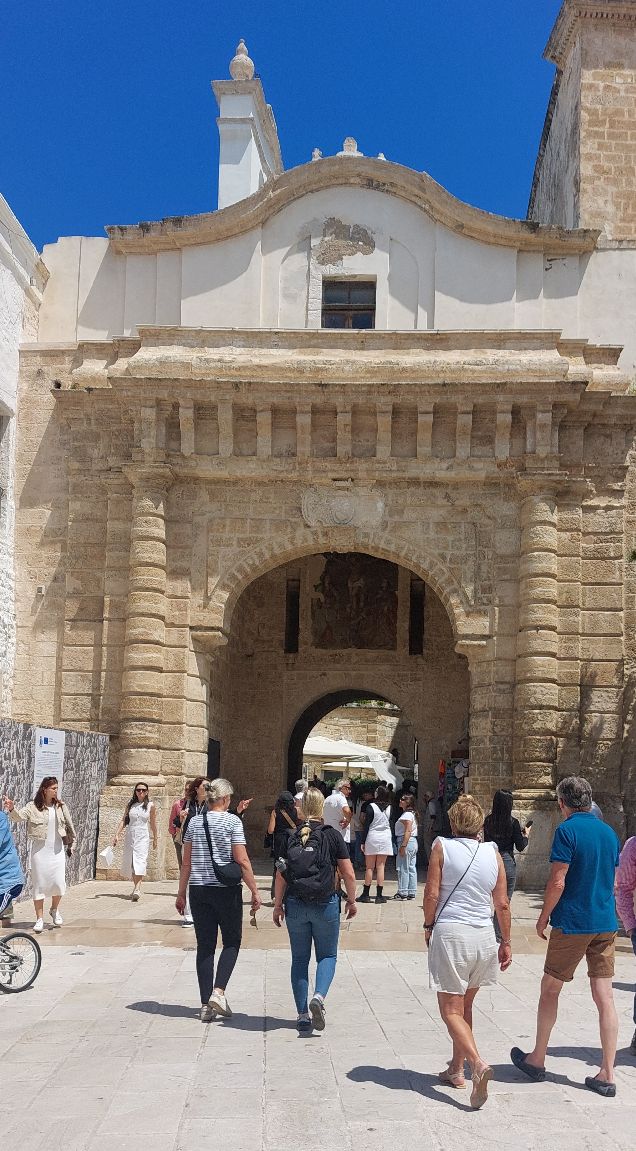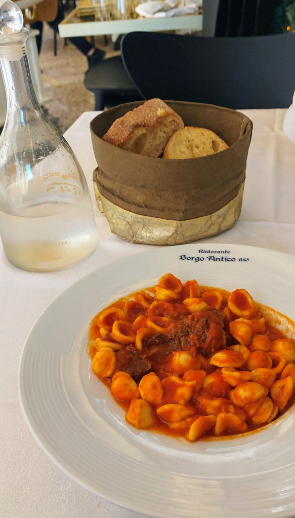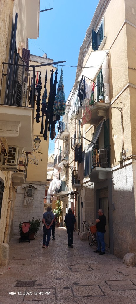 I walked some of the medieval walls, then strolled past the typical ticky-tacky souvenir shops. I didn’t see in the alleyways the nonnas (grandmothers) allegedy making orecchiete (little ears), the traditional pasta favored in the region, though some sources accuse them of displaying store-bought pasta. I walked to the port where I saw huge ferries that crossed east to Greece, Albania, or wherever. The huge cruise ships dock at a different port far enough away that they have to bus excursion groups into the historic center. I saw multiple groups of 35 to 40 people following a flag bearer/guide. I passed scores of side-walk cafes with menus posted in front and chose one with attractive white table cloths and bud vases. Orecchiete on the menu was offered several ways and I chose that with a ragu di Bari. The meat sauce held chunks of beef similar to short ribs in tomato sauce. To me, the pasta was much heavier than any I had tasted elsewhere. But I still had room for my first gelato of the trip, stracciatella. I had read that international chocolate prices have soared, perhaps why the amount of chocolate chips seemed stingy compared to previous tastings. I tested that theory several more times during the trip and concluded that chocolate content has definitely decreased, at least in this region.