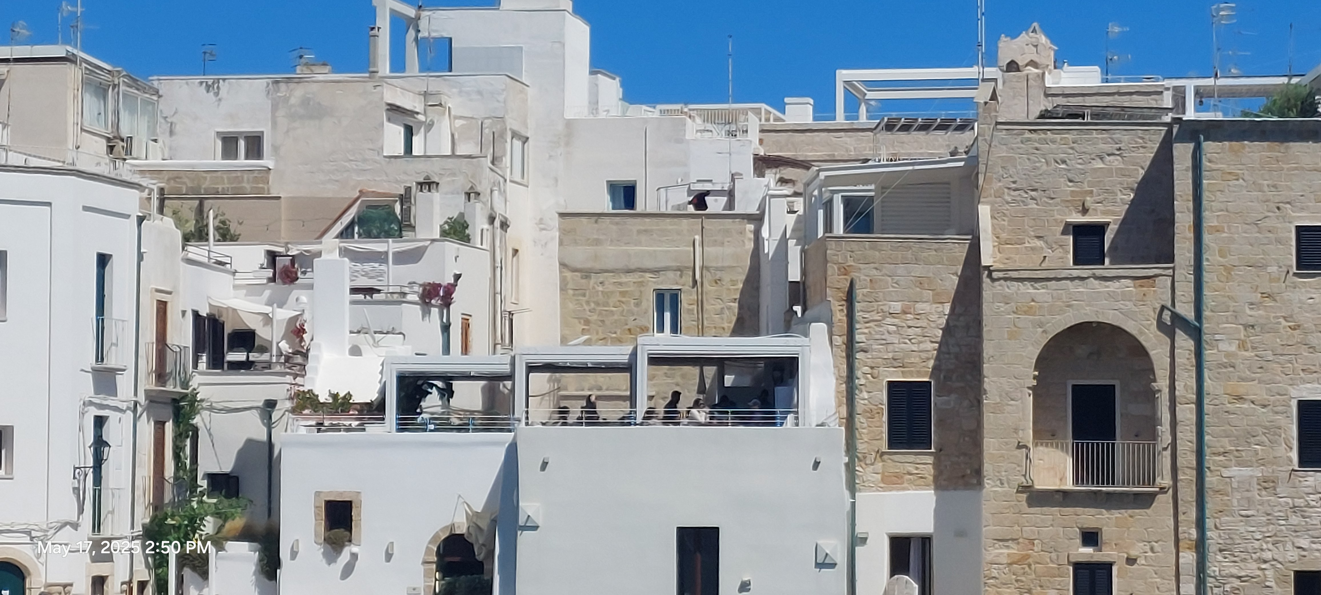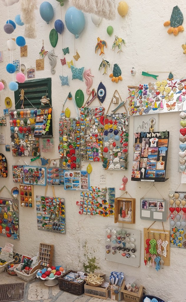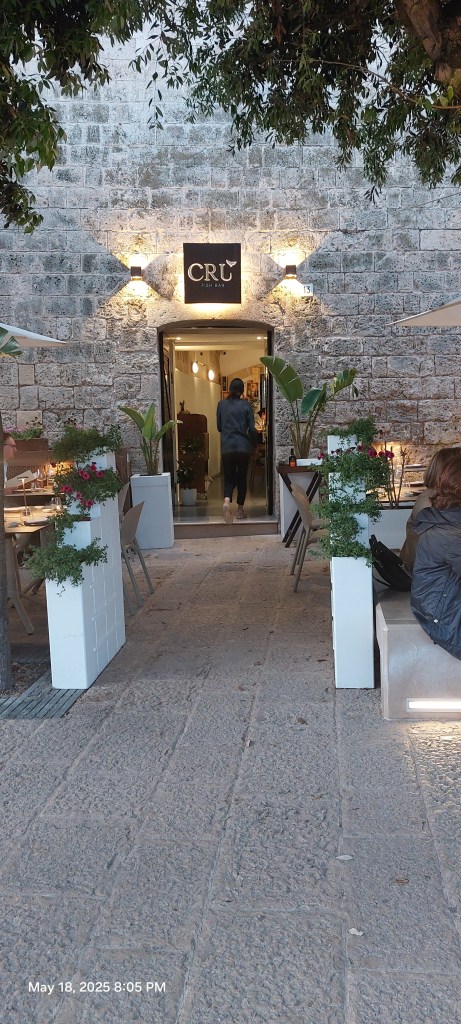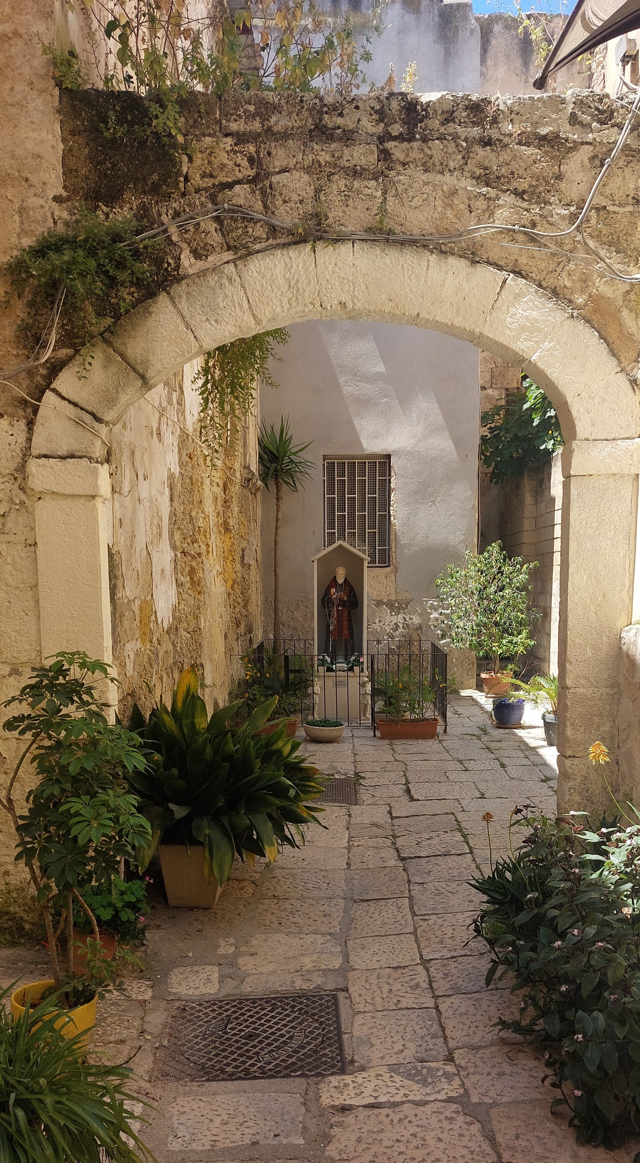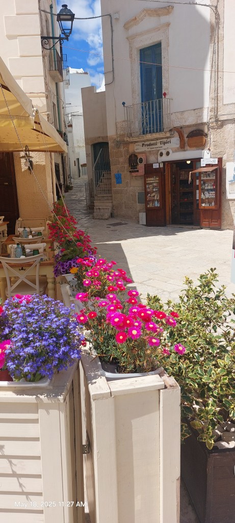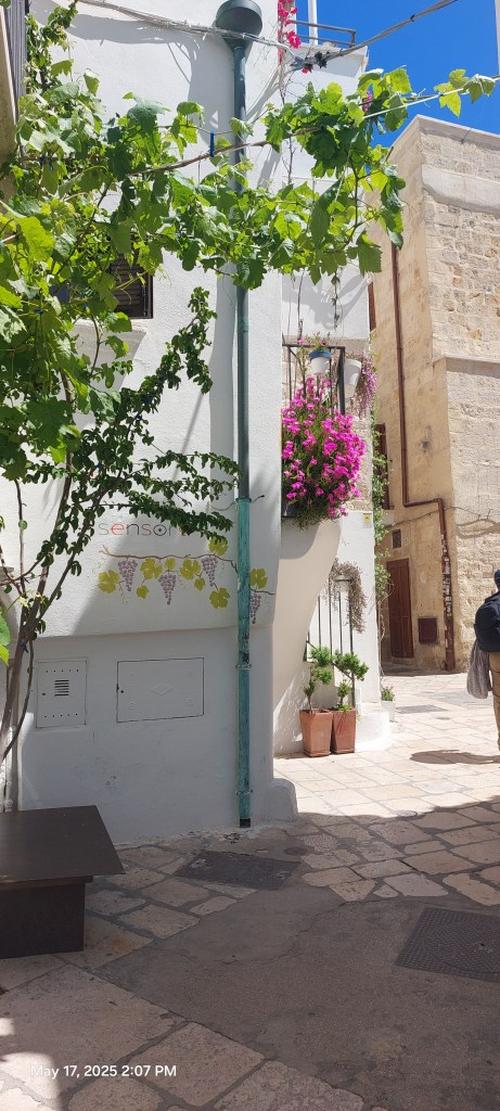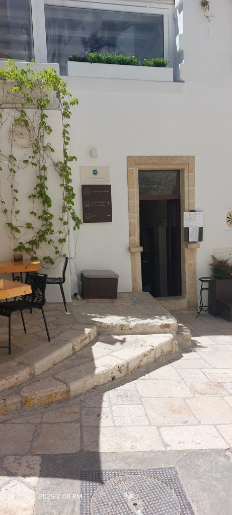 After lunch I explored more of the ancient city. Wandering the narrow alleys was not much different than in Bari Vecchia: lots of little shops and cafes, delightful arches leading into charming courtyards, colorful blooms hanging from whitewashed balconies, lots of little shops with ceramics, women’s scarves and jewelry, typical souvenirs. By late afternoon, still feeling jet lag, I needed a siesta. The room had good wifi reception and I could do some work before dinner.