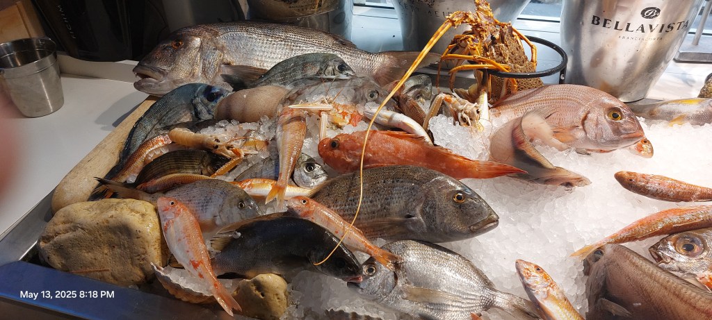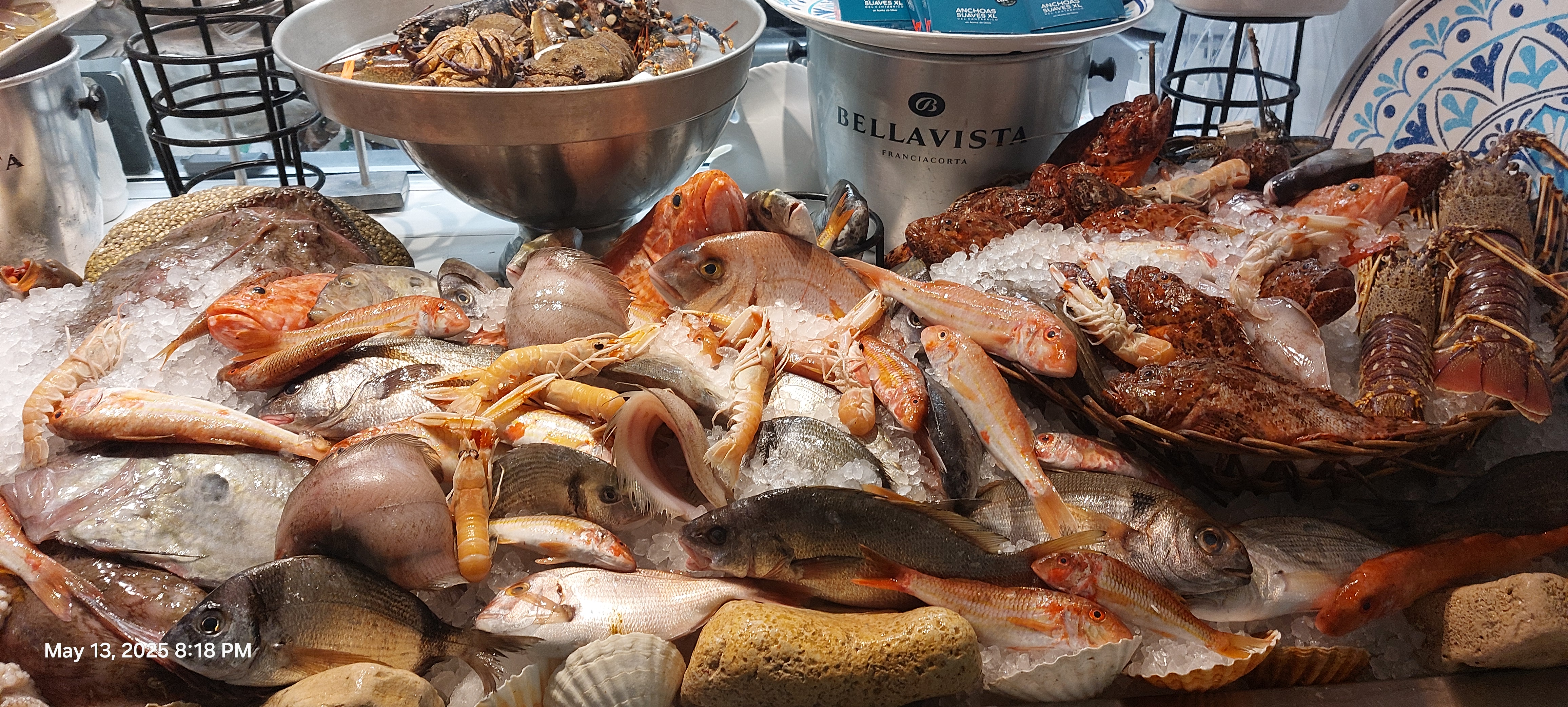 I love a relaxed breakfast when traveling, and the hotel buffet was lavish with hot and cold dishes, my favorite cold cuts, and a huge pastry table with temptations I don’t allow myself at home. At night, the breakfast salon becomes a gourmet restaurant, Polvere di Stelle (Star Dust), reservation required. I was pleased to be able to get a table for dinner and not have to leave the hotel so soon after arrival. The restaurant is upscale with a pricey menu, but not as high-priced as I found in the Lake District. Hotel guests enjoy a free cocktail and a ten percent discount on meals. An Aperol Spritz or a glass of Prosecco cost only €8. Wine by the bottle is not an option when I am traveling solo so I didn’t bother to peruse the wine list. Food and service were superb and a grilled seafood platter was a delightful introduction to the region’s specialty.