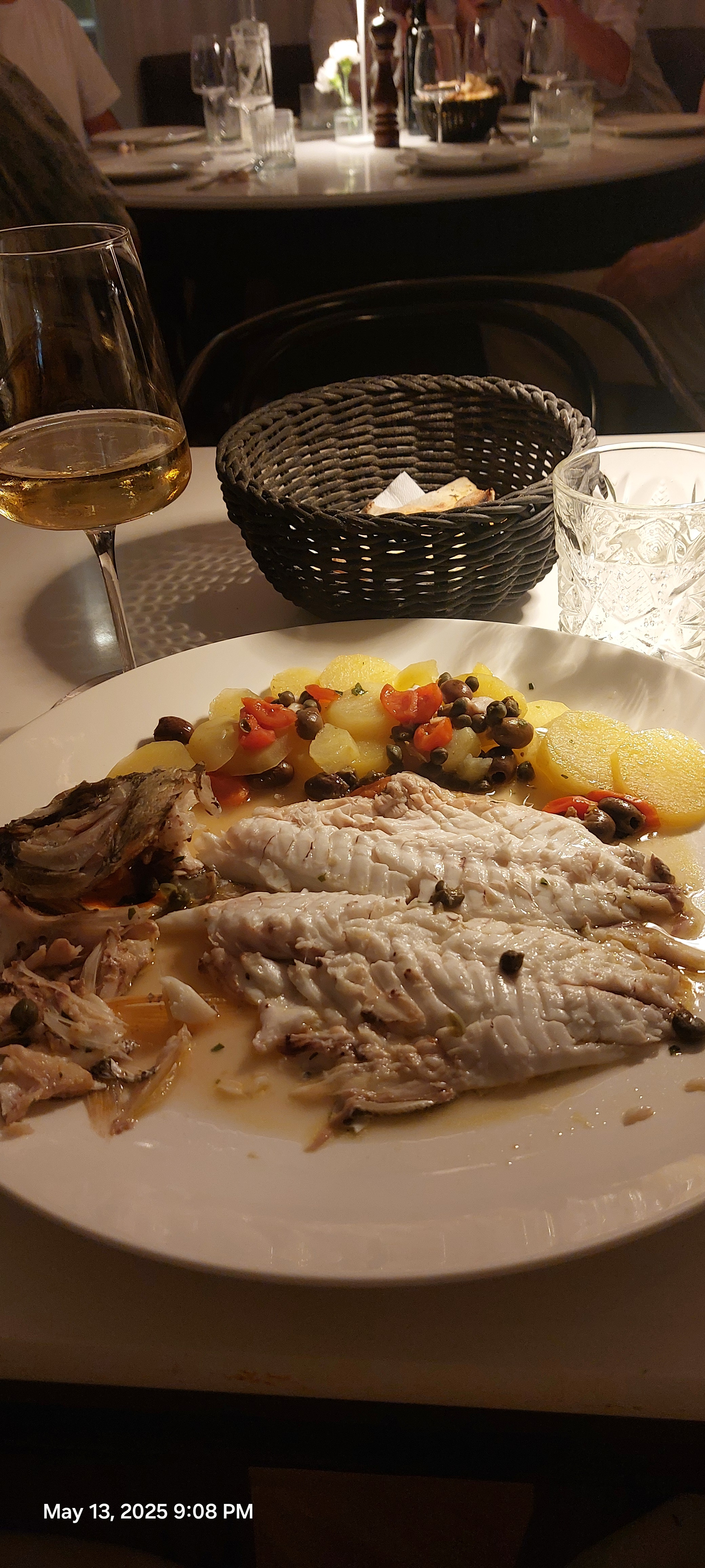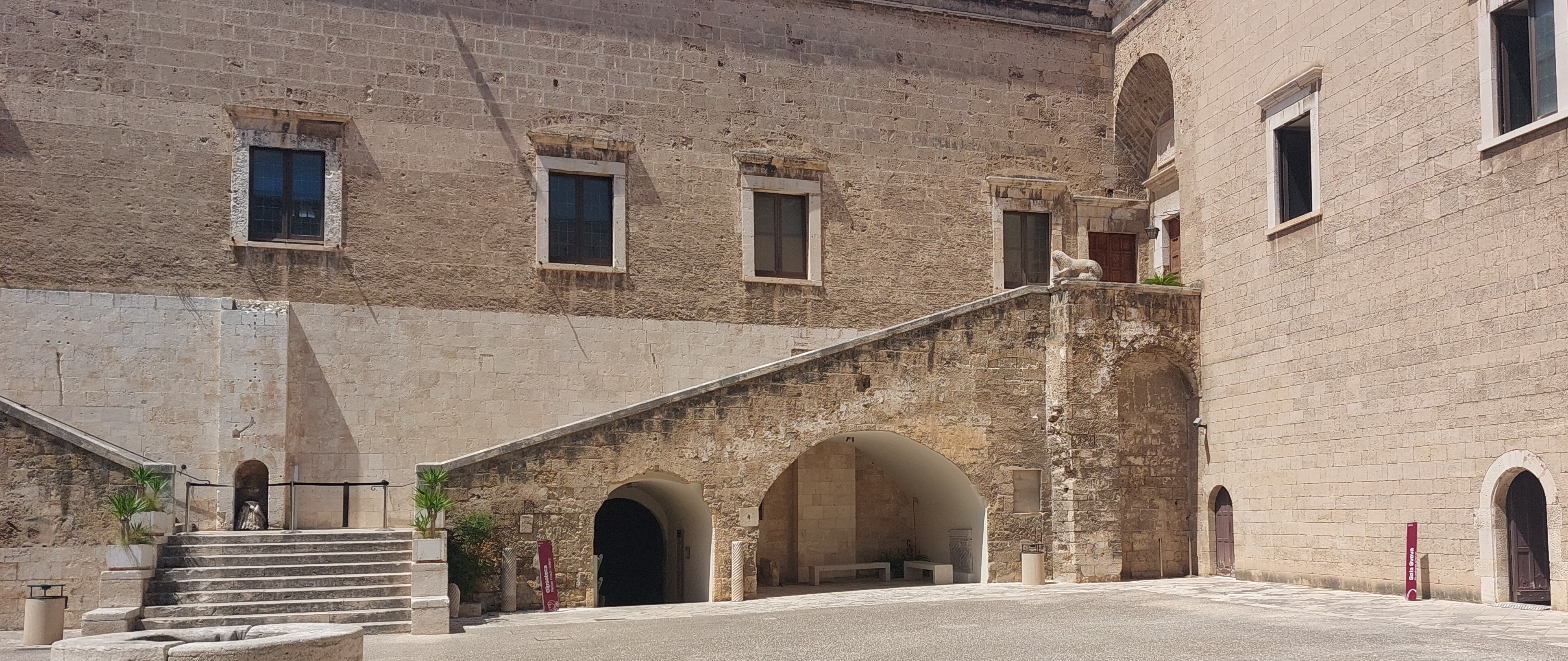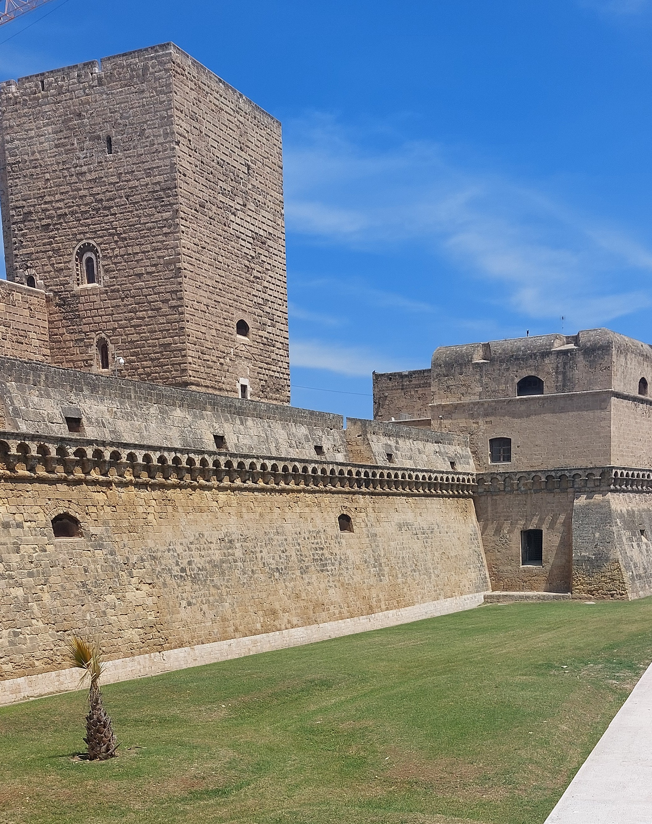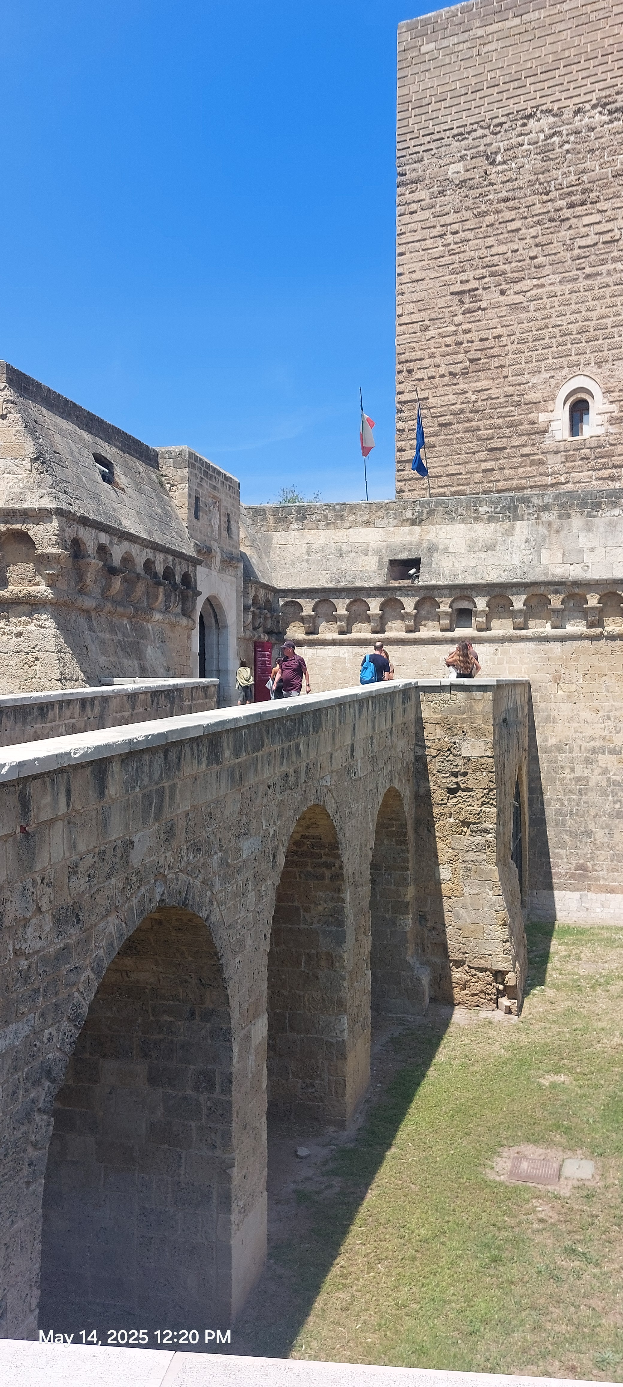 My sight-seeing interest had waned by the next day, with nothing compelling on the agenda. Against my better judgment, I returned to the Norman-Swabian castle, “one of the icons of Apulia,” built by Norman King Roger II about 1132. Over centuries it was destroyed and rebuilt by other invaders, finally ending up in the hands of the King of Sicily. Later it became a prison, a military barracks, and now just an exhibition venue. (Wikipedia). After paying the €10 entrance fee, the clerk told me that only the first floor was open, the upper floor closed for renovations. No value for price here, although I wasn’t disappointed at skipping staircases. At least the castle provided one of the few public toilets in the historic center. My attention span diminishing, I was thinking of giving Saint Nick a chance but thought better of it in favor of an early lunch and restful afternoon. My usual intellectual curiosity was waning, and I decided five days in Bari were too many. I did enjoy a return to the hotel’s top-floor restaurant at night where I splurged on a small lobster appetizer and a baked whole seabass.