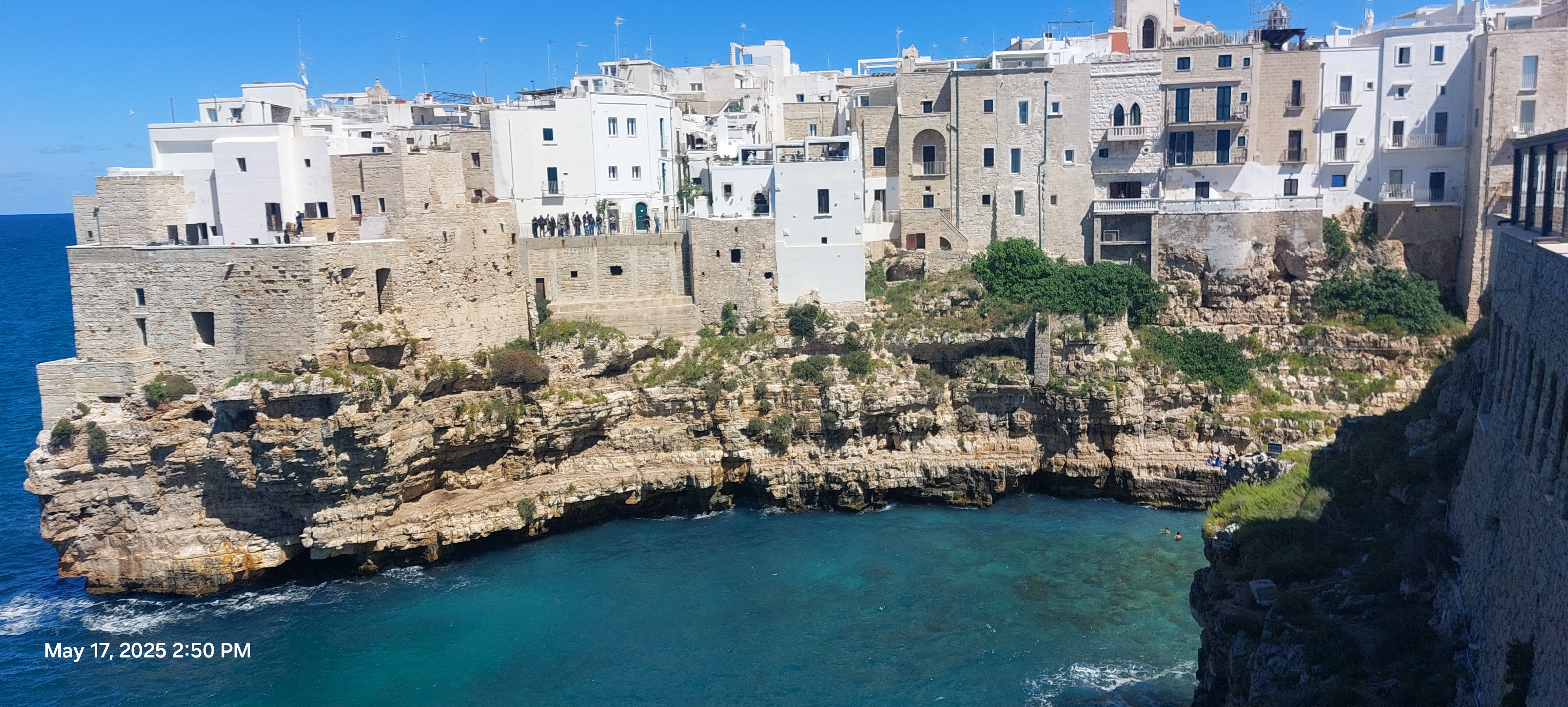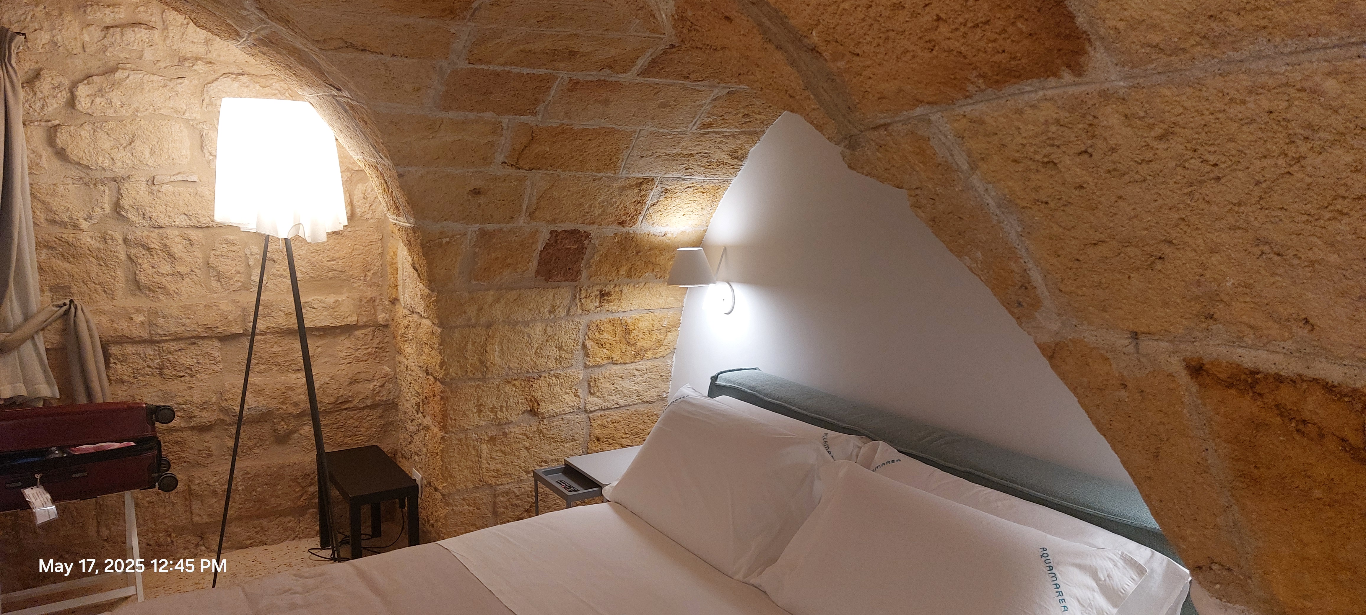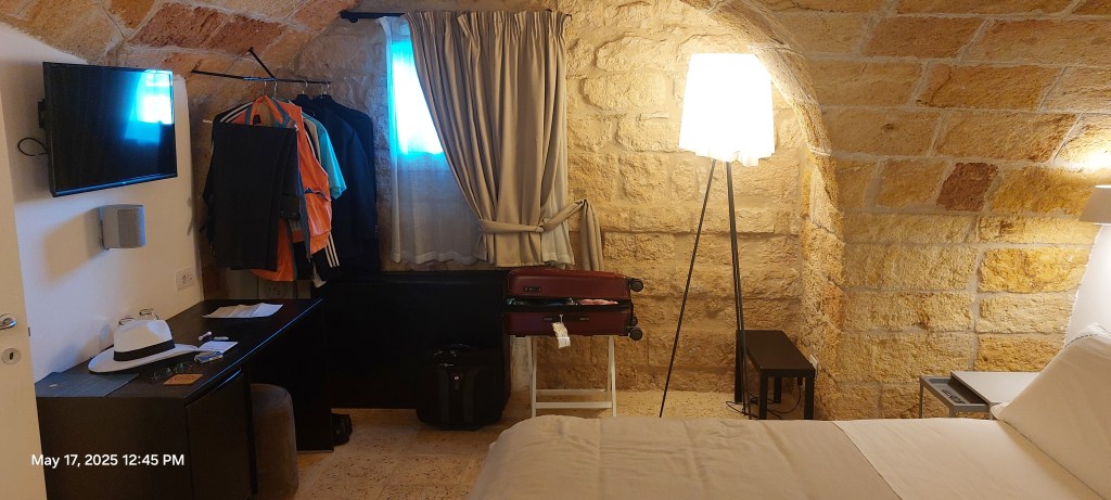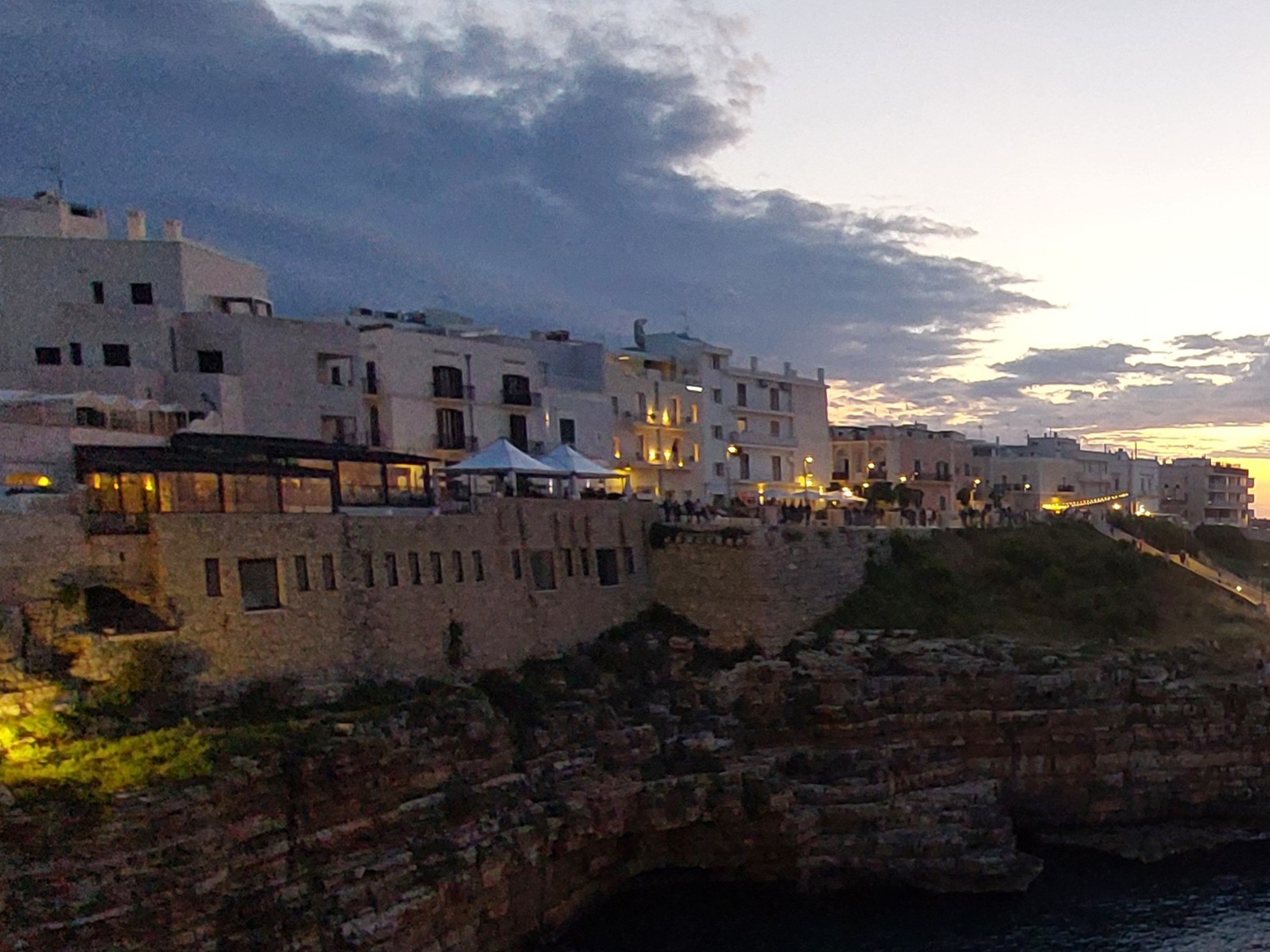 In my web search for “what to do” in Bari, all the agencies promoted a day trip to picturesque Polignano a Mare, so I had booked two nights there, thinking you can’t know a city on a day trip. The hotel arranged a driver for the pleasant ride of 35 minutes, more enjoyable for me since it was my first long conversation in Italian with loquacious driver Gerry (Geronimo). The hotel I reserved, Aquamarea, i,s located within the walled city of narrow streets, off limits to cars, so Gerry phoned reception to get arrival instructions to a nearby piazza. A hotel staff member, Cristiana, and another woman led me from the piazza to the hotel and helped with the luggage. (Wheels don’t work well on cobbled streets). The description of Aquamarea on Booking.com did not say there were only four rooms, nor was I aware that the room I booked was down a staircase into a cellar. I had read descriptions of so many hotels before booking, I neglected to look at all the photos or I would have seen the stairway and other photos that would have concerned me. My “deluxe” room might be a charming grotto to some; for me it was a claustrophobic cave. The narrow staircase had a railing only part way and, as an octogenarian, I am wary of falls that have had drastic consequences for several friends. The “sea view” in the list of amenities was a small window about two feet square, the only natural light in the room, and you had to go right up to it and strain to get a partial view of the water. Due to my crestfallen reaction and the upper rooms occupied, Cristiana took me to see a spacious room in a neighboring hotel for 200 euros more, or she said I could have a room for the same price in another hotel, “not nearby.” I decided to swallow the disappointment for two nights and later regretted the decision.