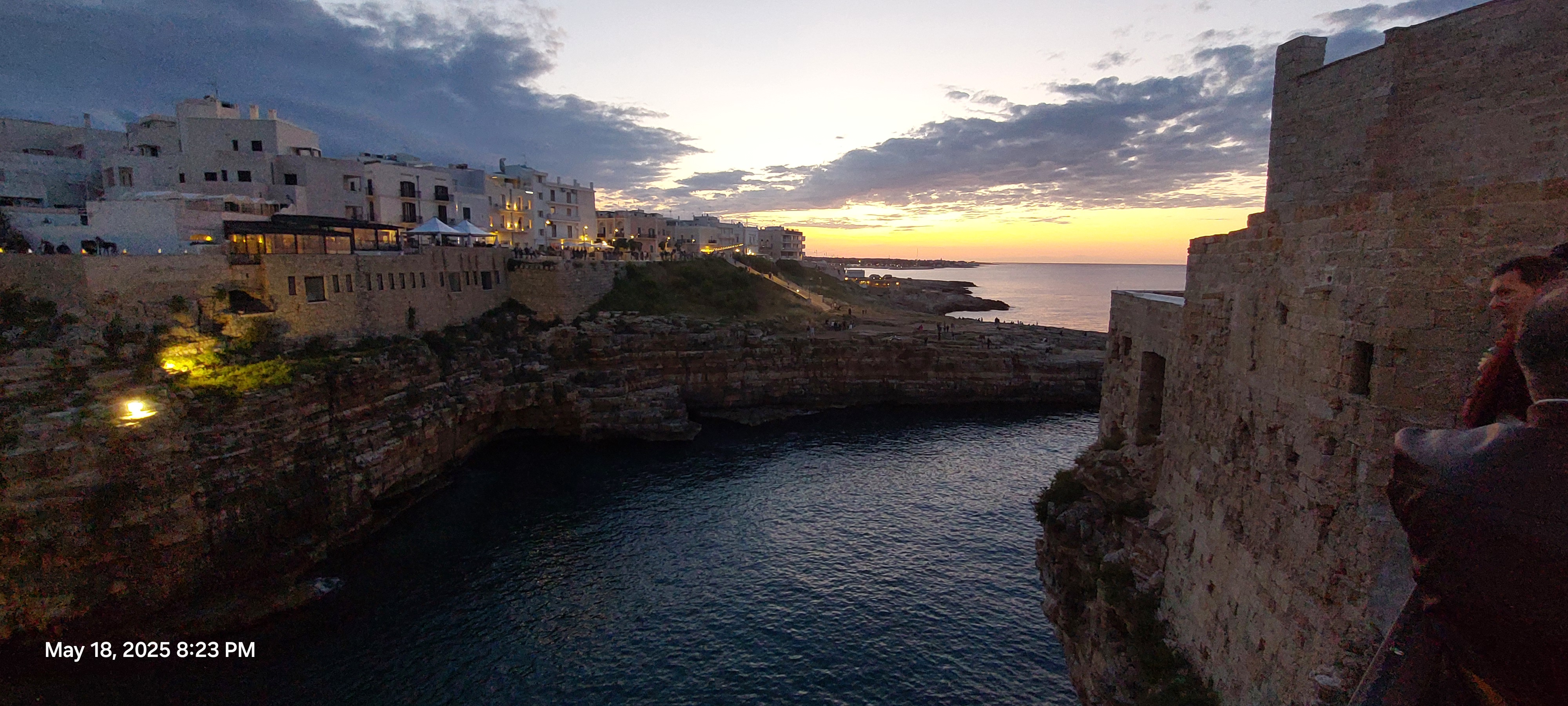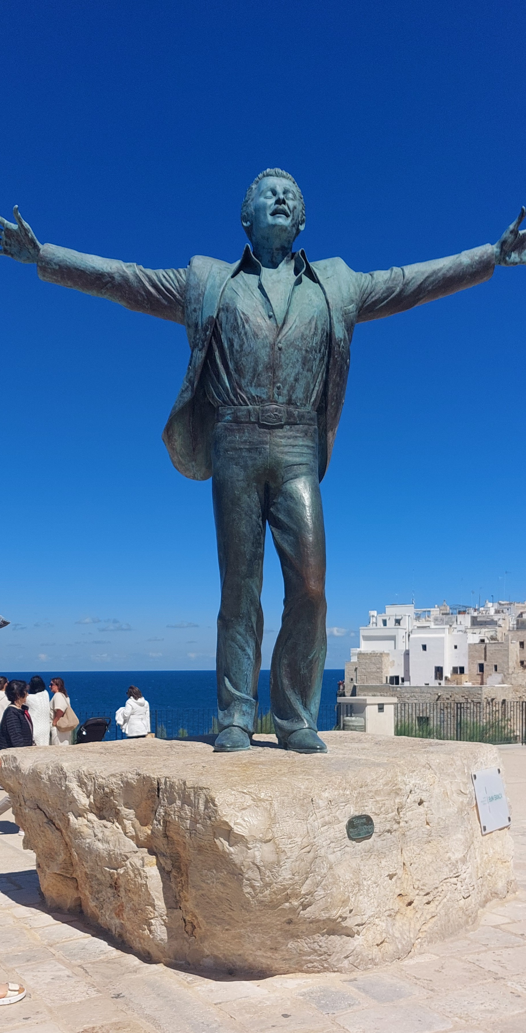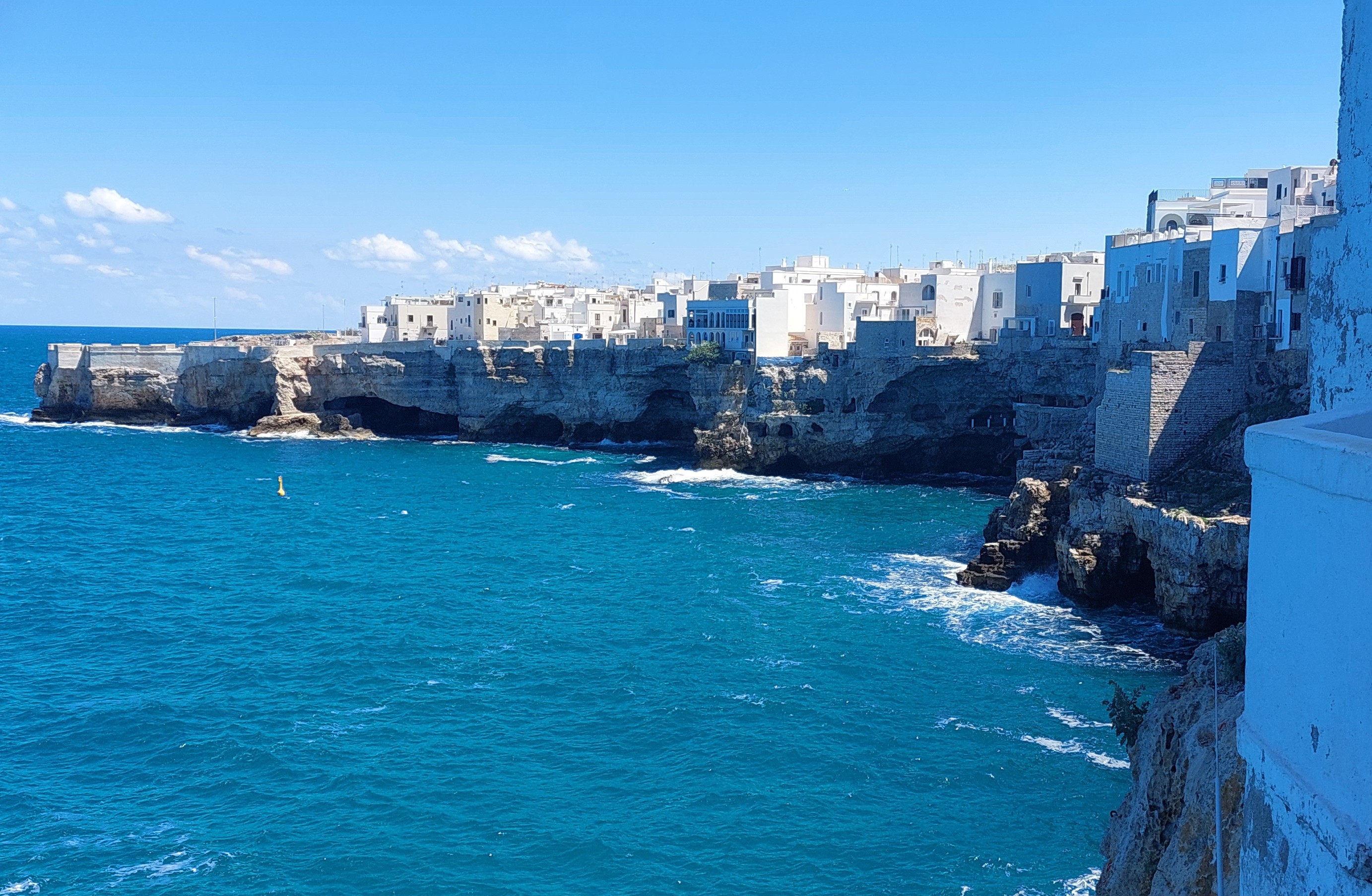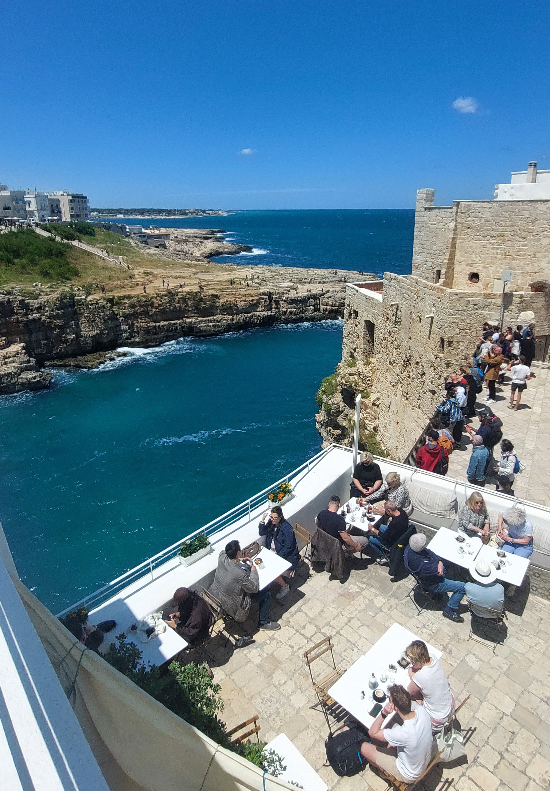 In my web search for “what to do” in Bari, all the agencies promoted a day trip to picturesque Polignano a Mare, so I had booked two nights there, thinking you can’t know a city on a day trip. The hotel arranged a driver for the pleasant ride of 35 minutes, more enjoyable for me since it was my first long conversation in Italian with loquacious driver Gerry (Geronimo). The hotel I reserved, Aquamarea, i,s located within the walled city of narrow streets, off limits to cars, so Gerry phoned reception to get arrival instructions to a nearby piazza. A hotel staff member, Cristiana, and another woman led me from the piazza to the hotel and helped with the luggage. (Wheels don’t work well on cobbled streets). The description of Aquamarea on Booking.com did not say there were only four rooms, nor was I aware that the room I booked was down a staircase into a cellar. I had read descriptions of so many hotels before booking, I neglected to look at all the photos or I would have seen the stairway and other photos that would have concerned me. My “deluxe” room might be a charming grotto to some; for me it was a claustrophobic cave. The narrow staircase had a railing only part way and, as an octogenarian, I am wary of falls that have had drastic consequences for several friends. The “sea view” in the list of amenities was a small window about two feet square, the only natural light in the room, and you had to go right up to it and strain to get a partial view of the water. Due to my crestfallen reaction and the upper rooms occupied, Cristiana took me to see a spacious room in a neighboring hotel for 200 euros more, or she said I could have a room for the same price in another hotel, “not nearby.” I decided to swallow the disappointment for two nights and later regretted the decision.