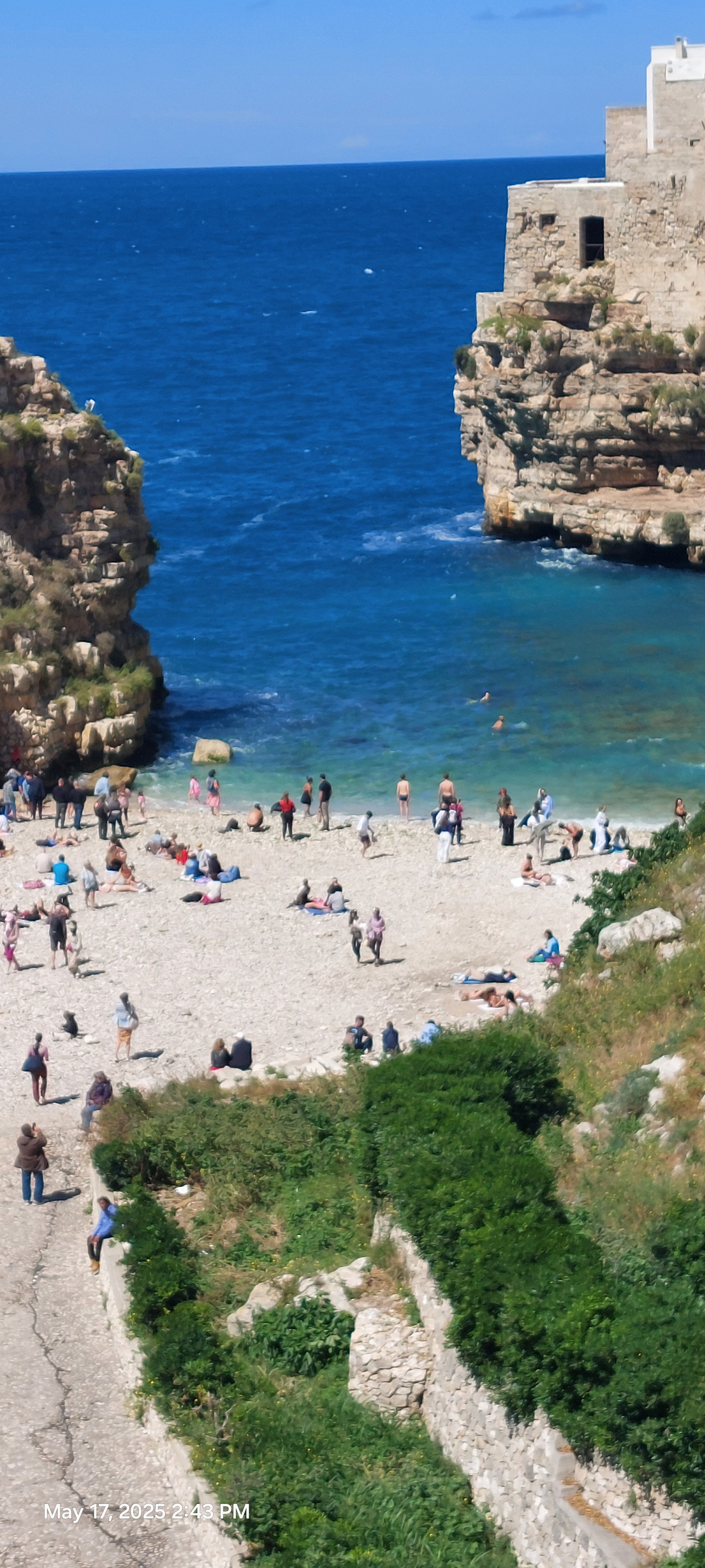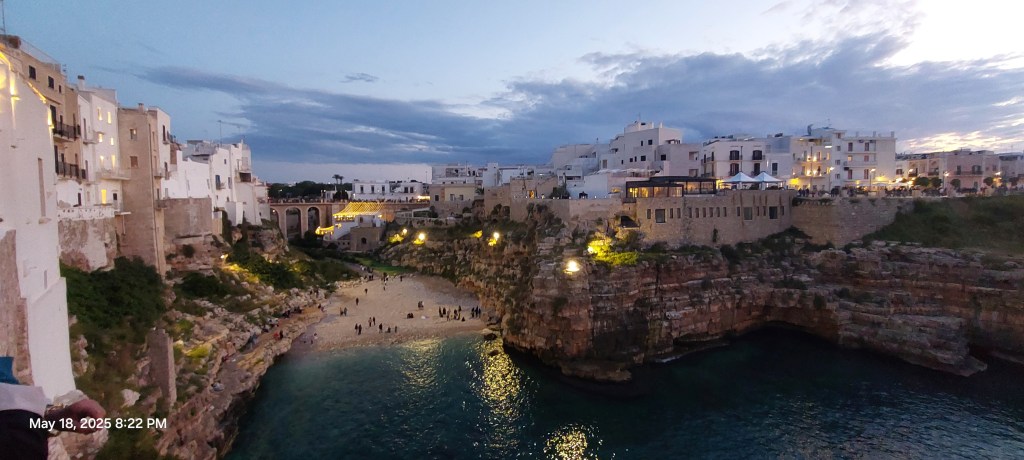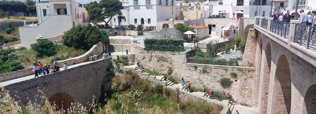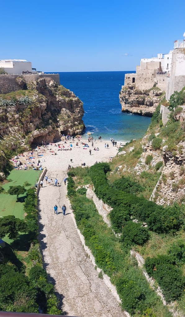 Cristiana gave me a coupon for a free drink in the small rooftop restaurant but the wind was so chilly I declined to have lunch there. After unpacking, I took an orientation walk around the labyrinthian streets past the main piazza to the bridge overlooking the iconic Monachile beach. The bridge was constructed over an ancient Roman span. Beneath it, a long-winding stairway with scores of steps leads down to the tiny but splendid beach where some people were braving the 65-degree weather and icy water to swim. I could see some of the sections of the stairway did not have railings, and the sheer distance down made me satisfied with the view from above. Several cafes next to the bridge offered sit-down meals and I settled for a light lunch at a table overlooking the beach.