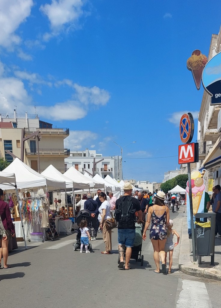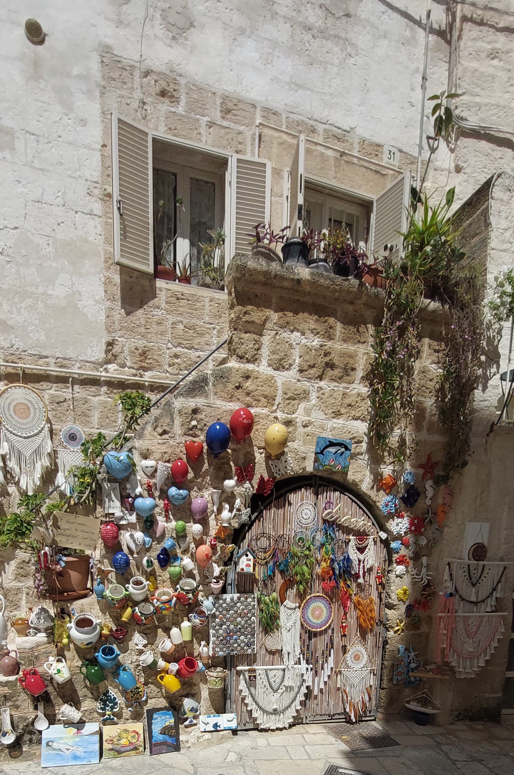 On Sunday morning after a nice breakfast of fresh strawberries and a huge croissant sandwich of ham and local cheese, I explored more of the city. There was an outdoor market in the piazza just outside the walls, the stands offering mostly women’s jewelry, ceramics, nuts and jams, and souvenirs. By early morning the crowds began to arrive and the whole historic center was mobbed. In some places you couldn’t pass the herd in front of you and had to wait for a clearing. I hadn’t expected the cruise ships in Bari to send so many busloads adding to the thousands of local residents of the region enjoying a Sunday excursion. There were lines out the door at some gelato shops. I should have scheduled my stay midweek, but even leaving town on Monday morning the tour groups had begun to arrive. Of course, there would not be crowds if the town was not so spectacular, and surely there would be fewer people in the cold months, but I don’t do windows or cold. I thought I had picked a region off the beaten path, but I doubt there is such place if it’s anywhere near a cruise ship dock.