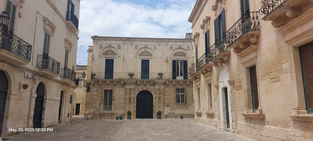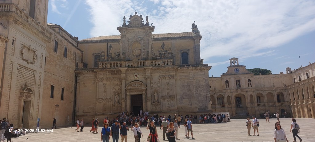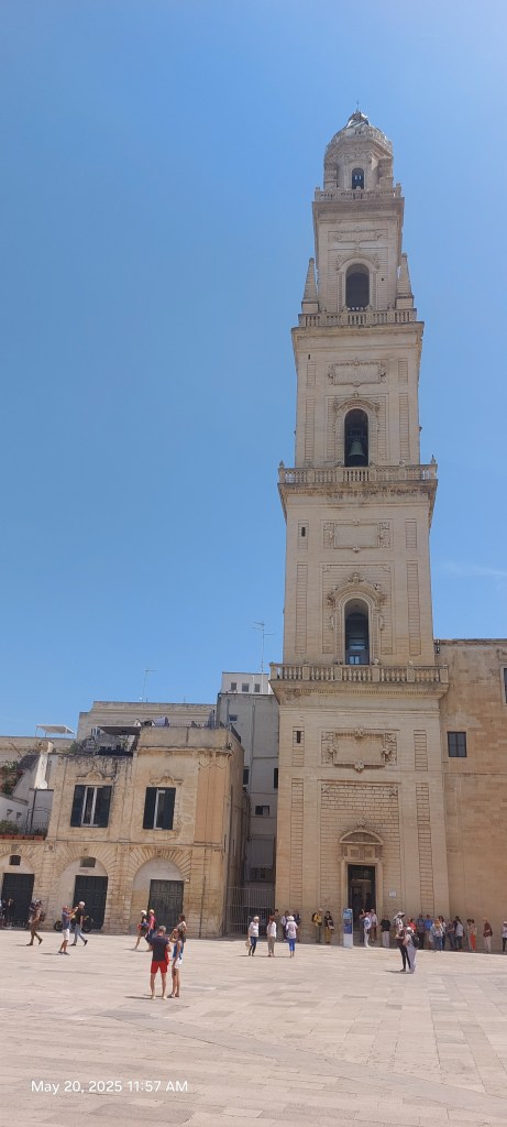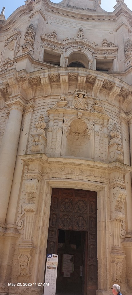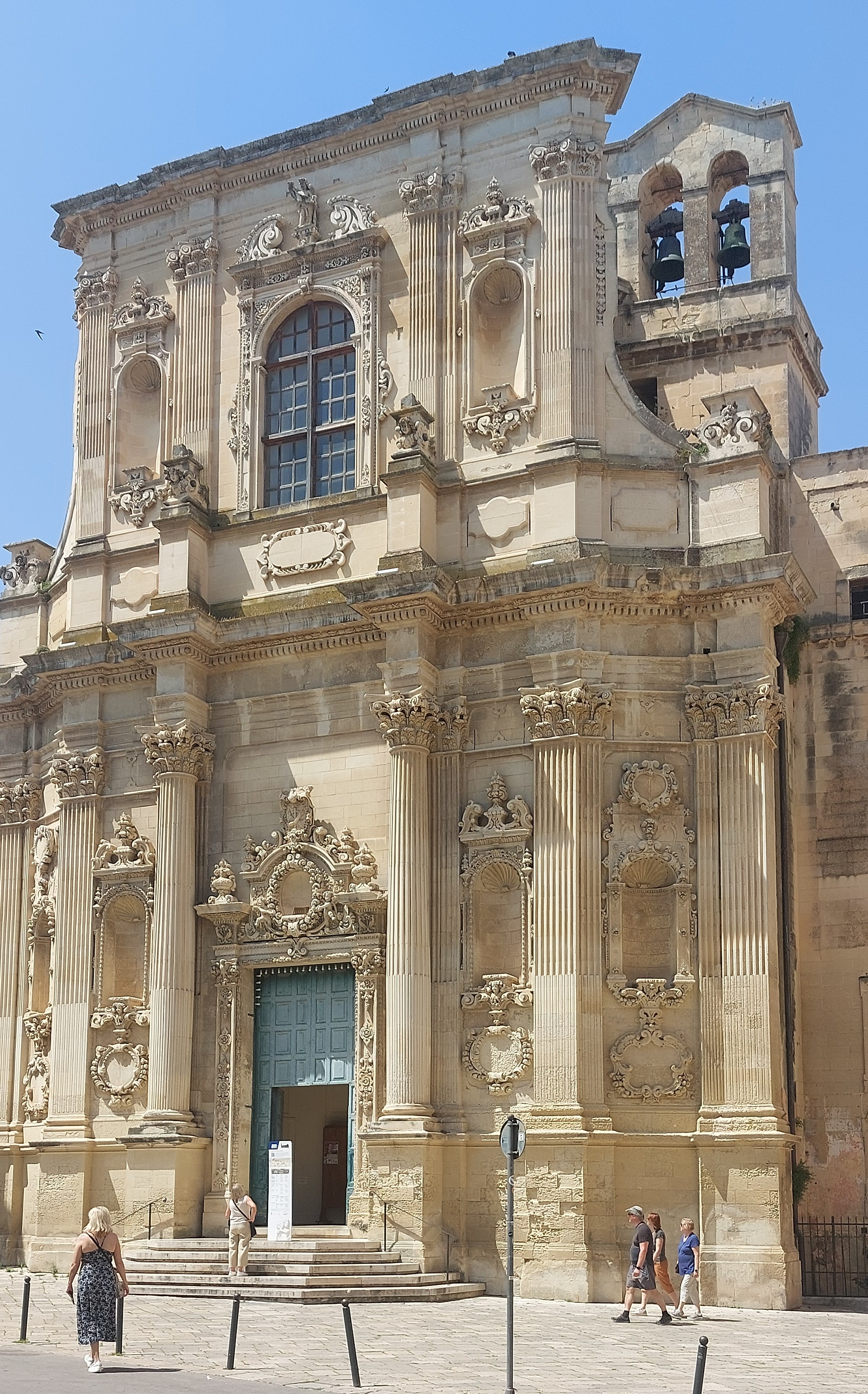There really isn’t much to do in Lecce other than admire the spectacular architecture, or visit some of the 24 churches if one is inclined. Alberto raved about the Duomo (cathedral) and the “must see” Santa Croce (Holy Cross). I had to pay a €7 entrance in each of those two churches, although I could have seen many more churches with a €40 ticket. I skipped the cathedral tower that attracted an entry line of young people. I went back to Santa Croce with its spectacular baroque façade, more impressive outside than in. Two churches were just fine with me. My walk took me past San Matteo and Santa Chiara but I only tarried long enough for a photo.