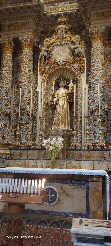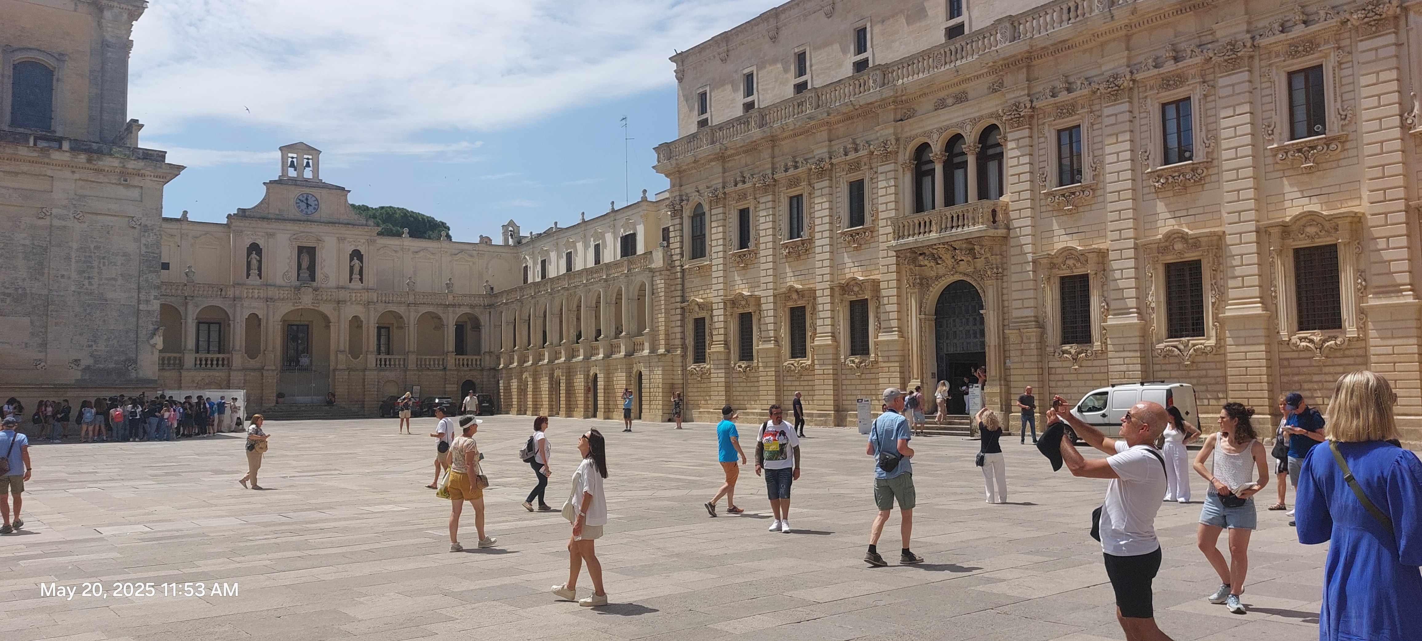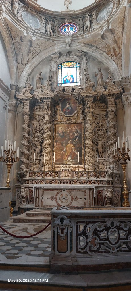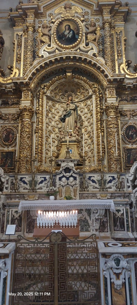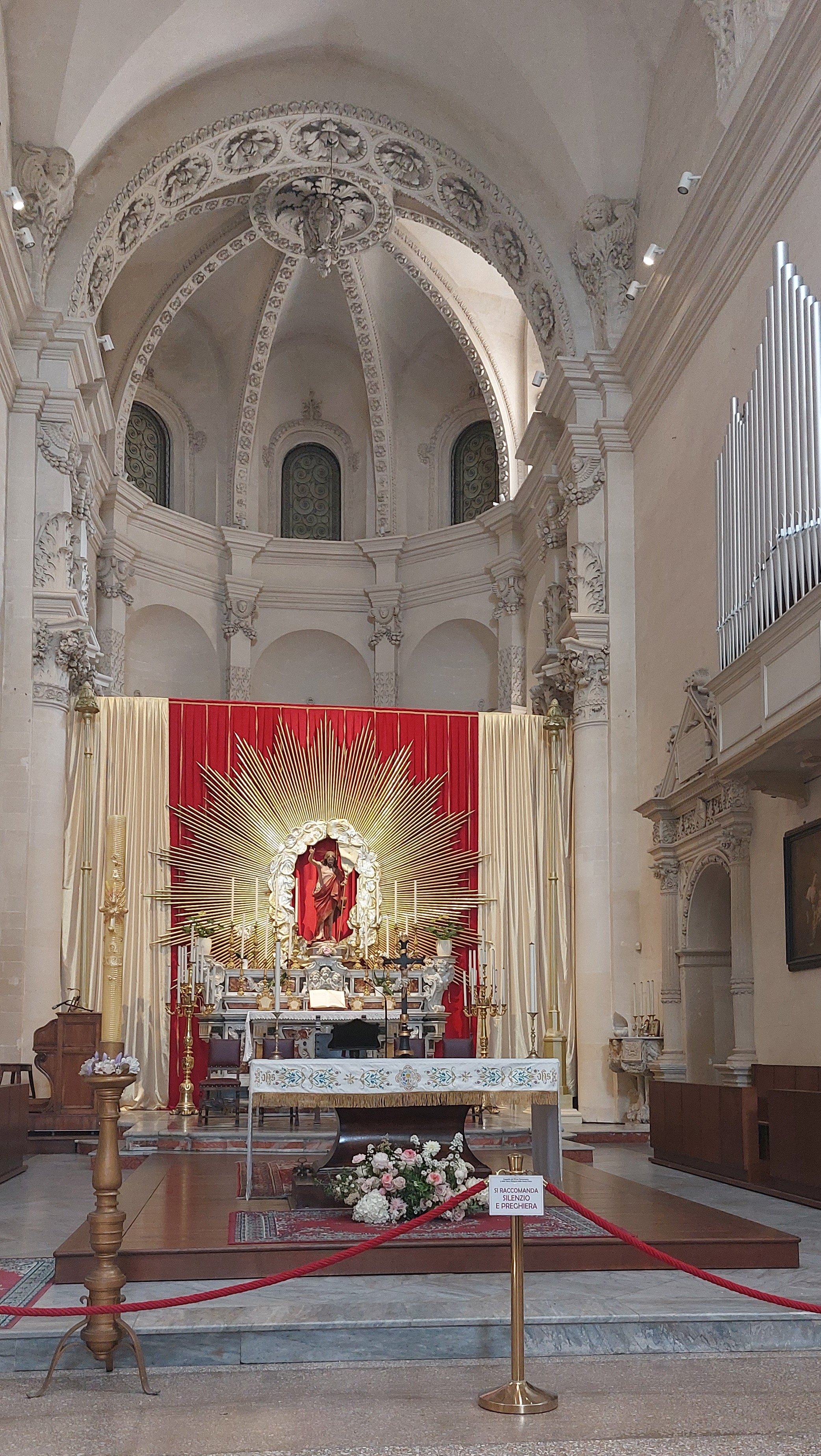 There really isn’t much to do in Lecce other than admire the spectacular architecture, or visit some of the 24 churches if one is inclined. Alberto raved about the Duomo (cathedral) and the “must see” Santa Croce (Holy Cross). I had to pay a €7 entrance in each of those two churches, although I could have seen many more churches with a €40 ticket. I skipped the cathedral tower that attracted an entry line of young people. I went back to Santa Croce with its spectacular baroque façade, more impressive outside than in. Two churches were just fine with me. My walk took me past San Matteo and Santa Chiara but I only tarried long enough for a photo.